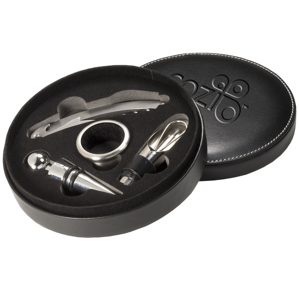 The minimum order for this product is 20 piecesWith all of the pieces fitting securely inside of the EVA foam insert, the Leeman Black Executive Wine Accessory Set from Leeman makes the perfect gift to reward your team of high achievers for their hard work. The stainless-steel waiter-style wine key steals the show by offering users stability and long lasting durability. Use the zinc alloy bottle stopper to store beverages for future consumption. The padded PVC leather case protects the tools stored inside against strong impacts and moisture damage. Add your company logo to turn the Executive Wine Accessory Set into a powerful marketing platform.