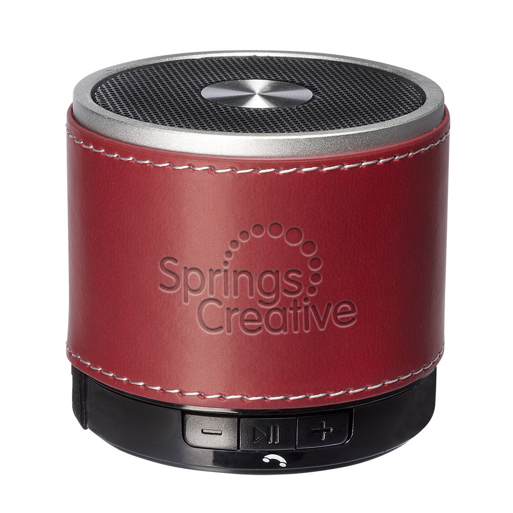 The minimum order for this product is 12 piecesImagine a speaker that puts out pristine audio that is just about the size of your one of your palms. The Leeman Red Tuscany Bluetooth Speaker defies conventional speaker design by offering you the option to play MP3 files through a USB flash drive or TF card. Attach your smartphone to the Bluetooth speaker and enjoy hands-free use. All you must do is push a button to answer phone calls. The stylish soft-PU accent wrap body gives the speaker a unique appearance that other people will notice. With attention focused on your Bluetooth speaker, face the custom logo you attached toward onlookers to market your company on business tips.