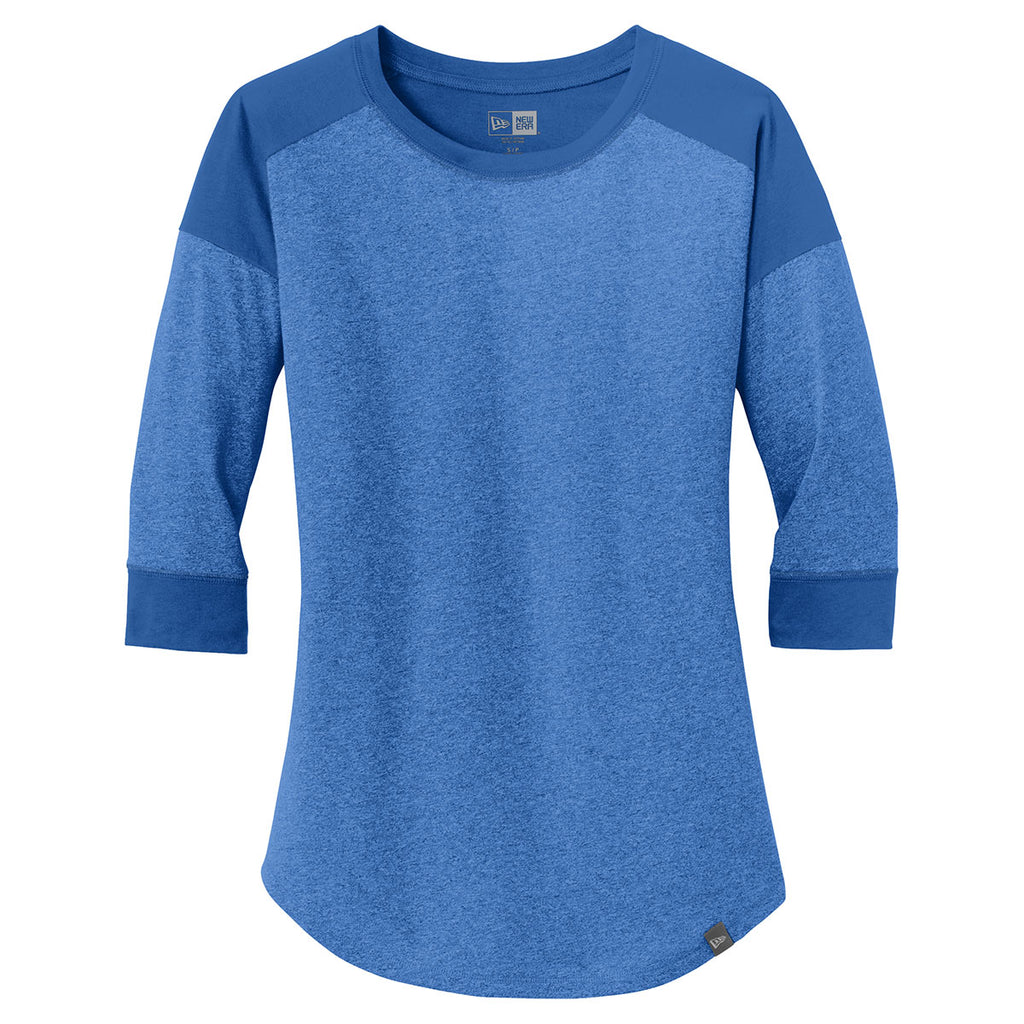Class heritage styles heavily influences the appearance of stylish custom logoed New Era Women's Royal/Royal Heather Heritage Blend 3/4 Sleeve Baseball Raglan Tee. With a scalloped hem and shoulder and back yoke color blocking the all-purpose tee is a fashion hit during business trips. Attach your corporate logo to let everyone know your company stands for delivering high-quality products. Cotton brings to the fashion table supreme comfort, while blended polyester resists rips and tears to give you a go to tee for all occasions. Raglan sleeves create more arm motion, which helps you reach difficult to access areas of your property.