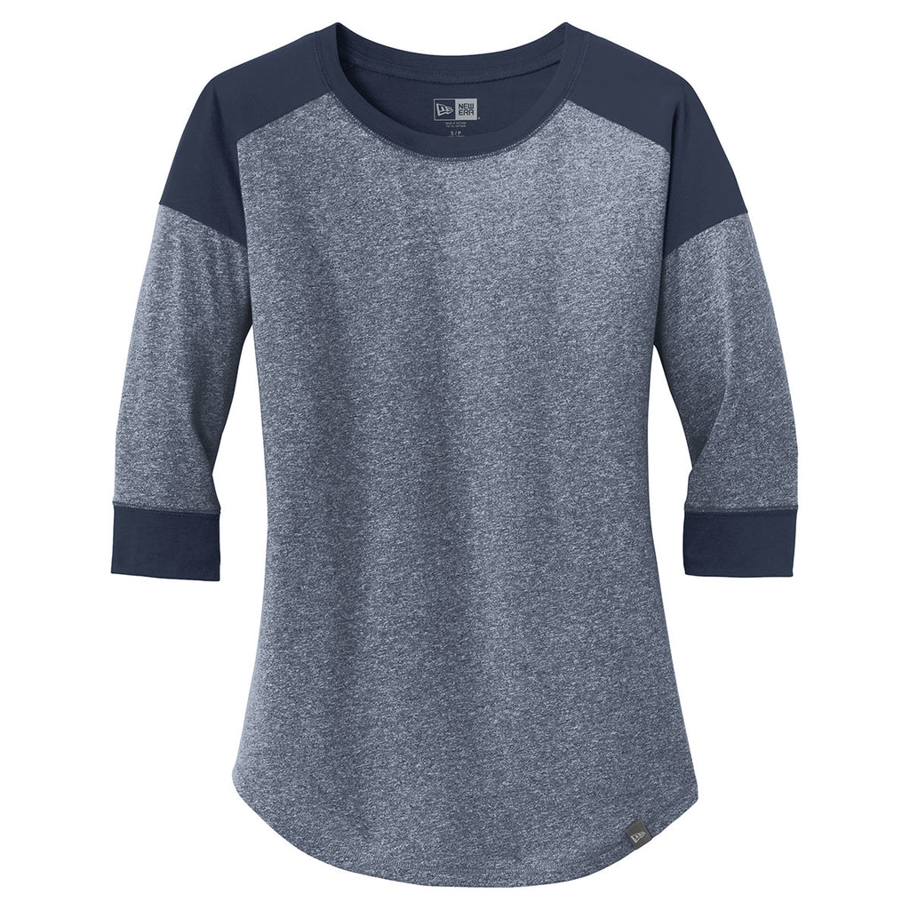 Class heritage styles heavily influences the appearance of stylish custom logoed New Era Women's True Navy/True Navy Twist Heritage Blend 3/4 Sleeve Baseball Raglan Tee. With a scalloped hem and shoulder and back yoke color blocking the all-purpose tee is a fashion hit during business trips. Attach your corporate logo to let everyone know your company stands for delivering high-quality products. Cotton brings to the fashion table supreme comfort, while blended polyester resists rips and tears to give you a go to tee for all occasions. Raglan sleeves create more arm motion, which helps you reach difficult to access areas of your property.