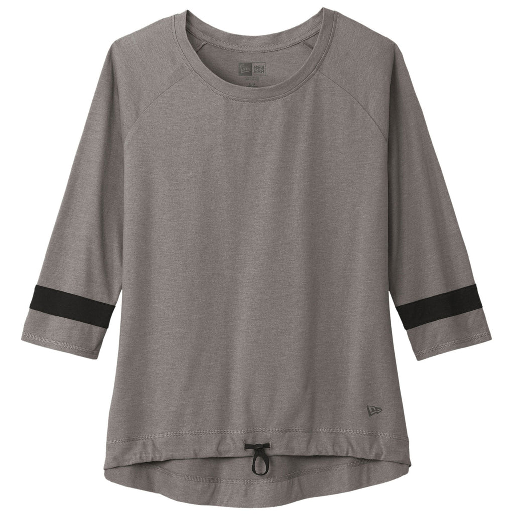 Enjoy some fun fashion flair with a custom New Era Women's Shadow Grey/ Black Solid Tri-Blend 3/4-Sleeve Tee. This creative 3/4-sleeve tee has a solid color base with coordinating color accents for a finished and more upscale look. The moisture wicking tee is ultra-soft and cinches with a drawcord at the waist for full coverage while being active. Add a company logo to use as employee apparel that will turn heads with a professional, yet fun look. Try out a custom logo to promote your logoed apparel line, team, cause, or organization in a unique way.