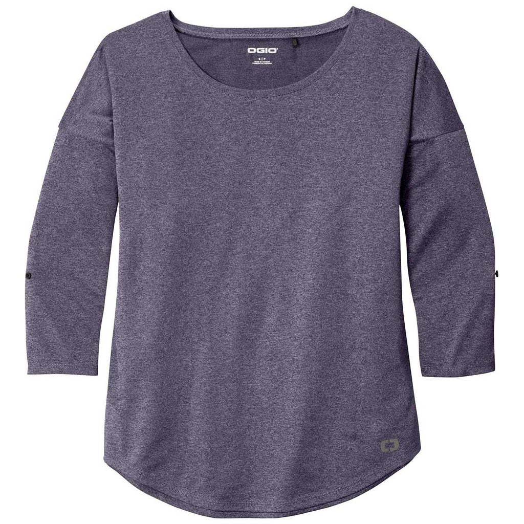 Add screen print to the OGIO Women's Navy Heather Gravitate Scoop 3/4-Sleeve to create a look that will look great no matter where you happen to be at the time. This flattering look has a beautiful drape that looks good on a variety of people. Made of a 100% poly fabric with stay cool wicking technology. The curved hem and Dolman shoulders paired with an open neck create a look that can serve as employee apparel with a company logo or a welcomed transition piece in your logoed apparel options. Great to wear alone or pair with a jacket, this simple 3/4 sleeve top is a must have.