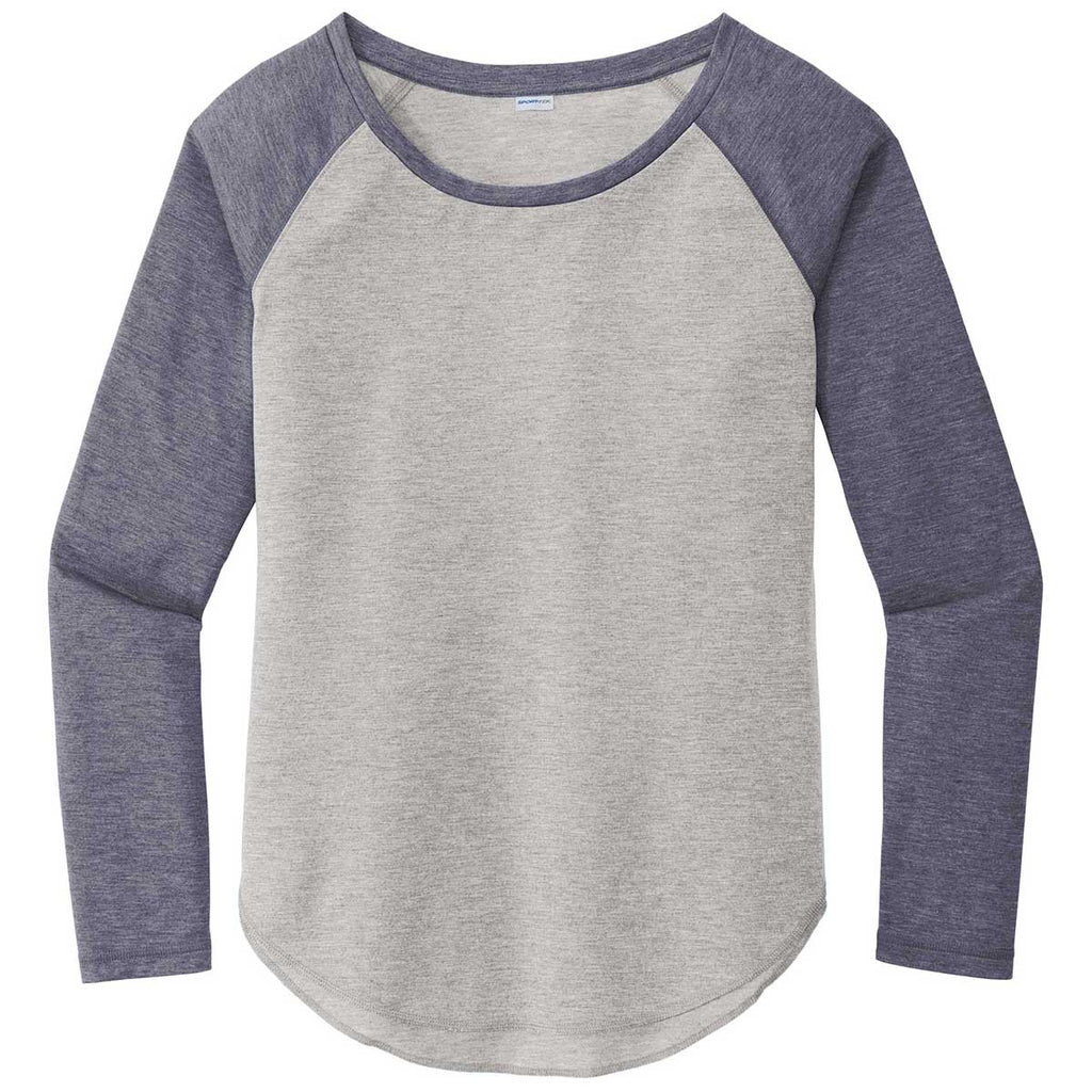 Sport-Tek Women's True Navy Heather/Light Grey Heather PosiCharge Long Sleeve Tri-Blend Wicking Scoop Neck Raglan Tee
