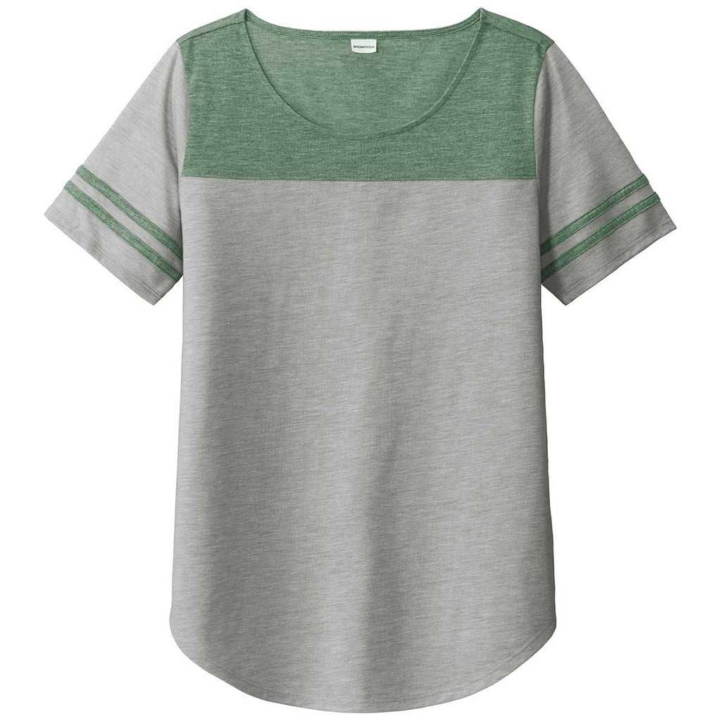 Be prepared on game day with a custom heat transfer Sport-Tek Women's Forest Heather/Light Grey Heather PosiCharge Tri-Blend Wicking Fan Tee. This ultra comfortable tee can have the heat transfer design of your choosing carefully placed to make sure you stand out on game day. Perfect for team events with a corporate logo of sponsors or just to wear to support a specific player. Available in a wide range of colors and sizes, this poly, cotton, rayon jersey blend is moisture wicking for the days when the weather is toasty. Contrasting front and back yoke and stripes on the sleeves make this tee a sports fan's dream. Add a company logo to give as employee gifts that will be enjoyed on game days.Highlights