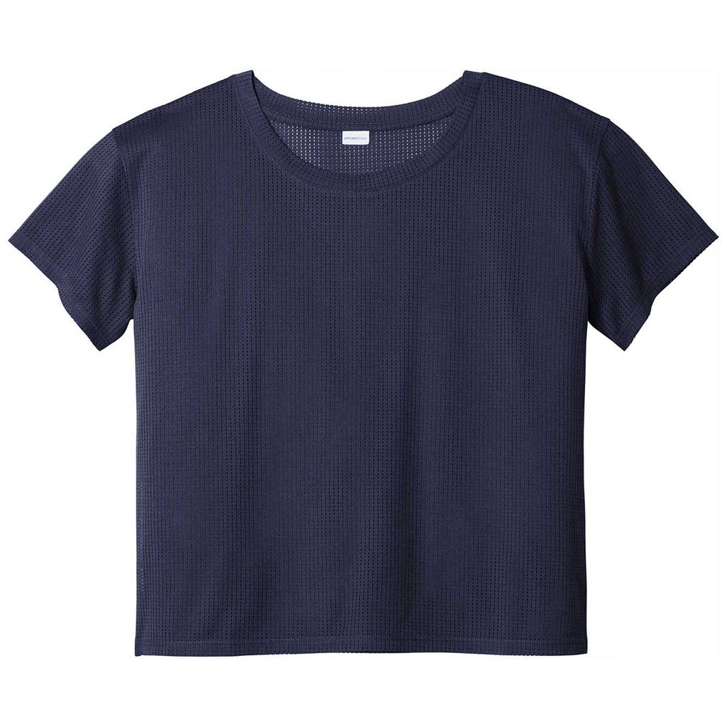 Look and feel great in a custom heat transfer Sport-Tek Women's True Navy PosiCharge Tri-Blend Wicking Draft Crop Tee. This crop top tee can be heat transferred with a custom design to wear anywhere you please or a company logo to be used as company uniforms for those that work in the fitness industry. The perfect design for those who enjoy a good workout, yoga, or exploring the outdoors. The boxier fitting tee is made of lightweight polyester tricot mesh with moisture locking performance. The all over open mesh fabric is great for layering over a sports bra or tank as an extra form of warmth. The drop shoulder provides a stylish flair to this workout type apparel.Highlights