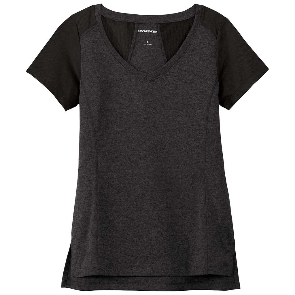 Stand out in the unique custom design of the Sport-Tek Women's Black Heather/Black Endeavor Short Sleeve Tee. The 100% polyester tee can hold the heat transfer of your choosing on the subtle heather texture. Perfect for an early morning workout, this tee has moisture wicking technology, breathability, and mesh panels at the targeted heat zones. Add a corporate logo to use these for team events and build team spirit. A custom logo would make these ideal as company uniforms for those working in the health and fitness areas. Created with a wide V-neck, drop tail hems, and dual colors, this tee is a must have.Corresponding Men's Style: Sport-Tek Men's Black Heather/Black Endeavor Short Sleeve Tee