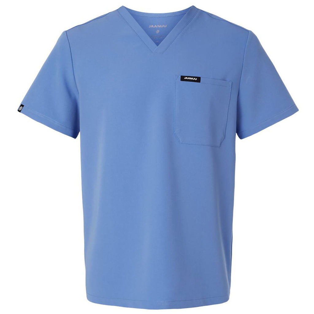 Jaanuu Men's Ceil Blue Holmes Everyday 1-Pocket Scrub V-Neck Top with a corporate logo offers a classic fit with moisture management properties. Made for the longest days at work, this scrub top is wrinkle and fade resistant whether you are saving lives, giving massages, or working with animals and need something easy to wash and wear.