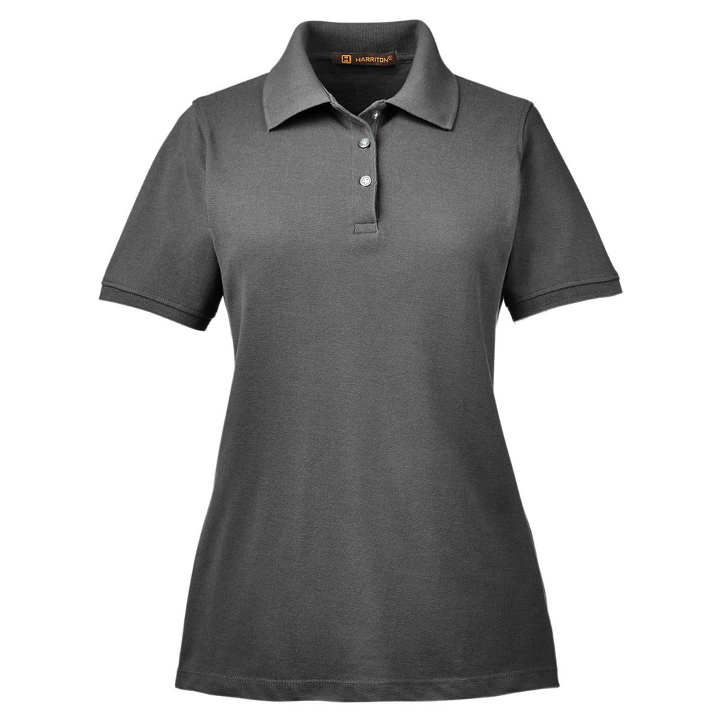 With a softly shaped design to create a more flattering feminine look, the Harriton Women's Charcoal 5.6 oz. Easy Blend Polo is sure to turn heads at your next business seminar. The flat-knit collar and cuffs complement the three-button placket to produce a stylish polo to wear at the office, as well as outdoors working on home improvement projects. Blended cotton and polyester never wrinkles to keep you looking professional throughout the day. The silky soft fabrication reduces shrinkage to ensure maximum comfort for years to come. Attach a custom logo that attracts the interest of customer prospects.Corresponding Men's Style: Harriton Men's Charcoal 5.6 oz. Easy Blend Polo