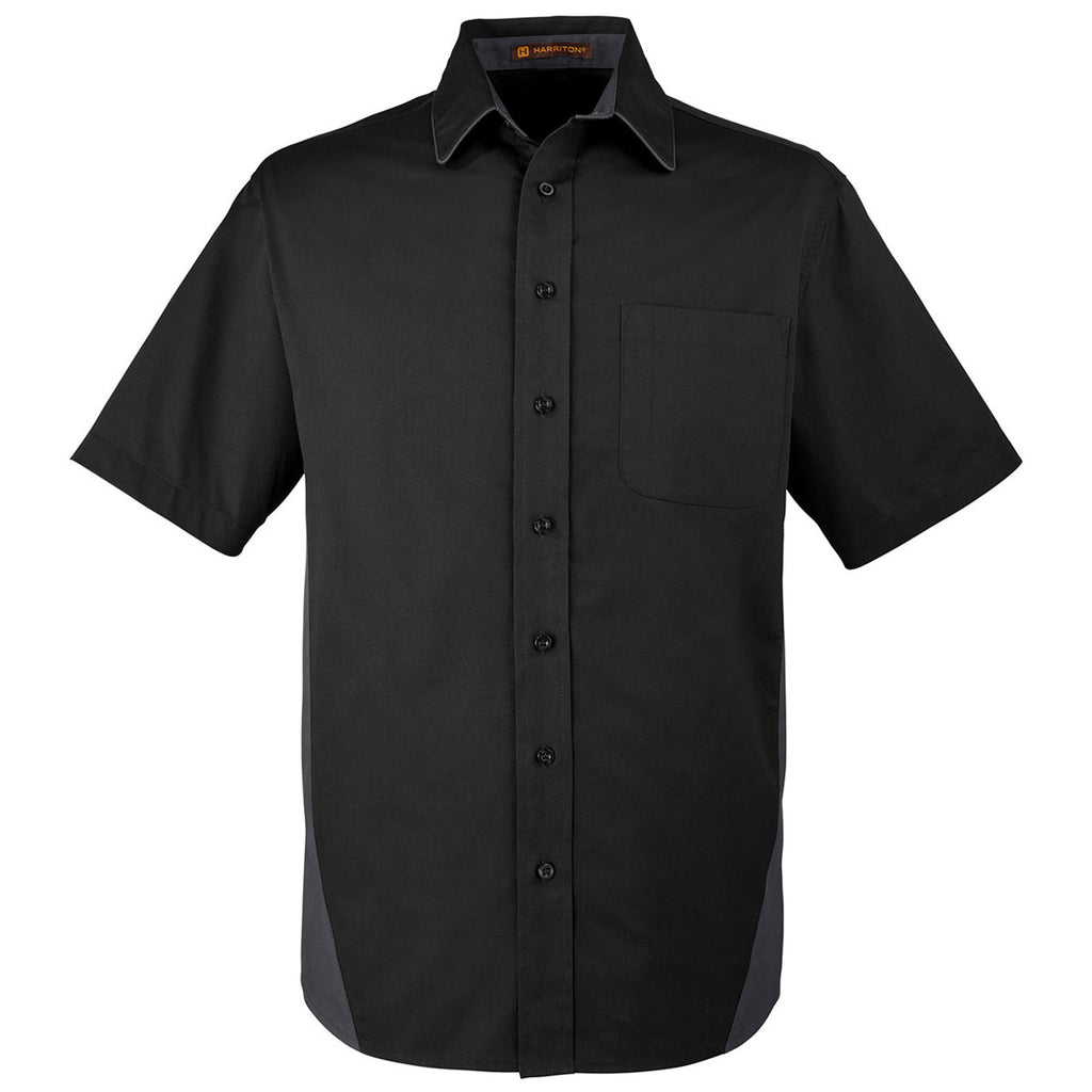 Enjoy a company logo on the Harriton Men's Black/Dark Charcoal Tall Flash Colorblock Short Sleeve Shirt to create employee apparel that can be worn as is or dressed up as corporate apparel as well. The short sleeve button up shirt is made of a cotton polyester twill blend with wrinkle resistance and stain release for day to day wear. Contrast details in all the right places create a unique look in this shirt that is available in tall sizes to find a proper fit for all. Ideal as employee gifts with a custom logo or to share with family and friends this shirt works well for many wardrobes.Highlights