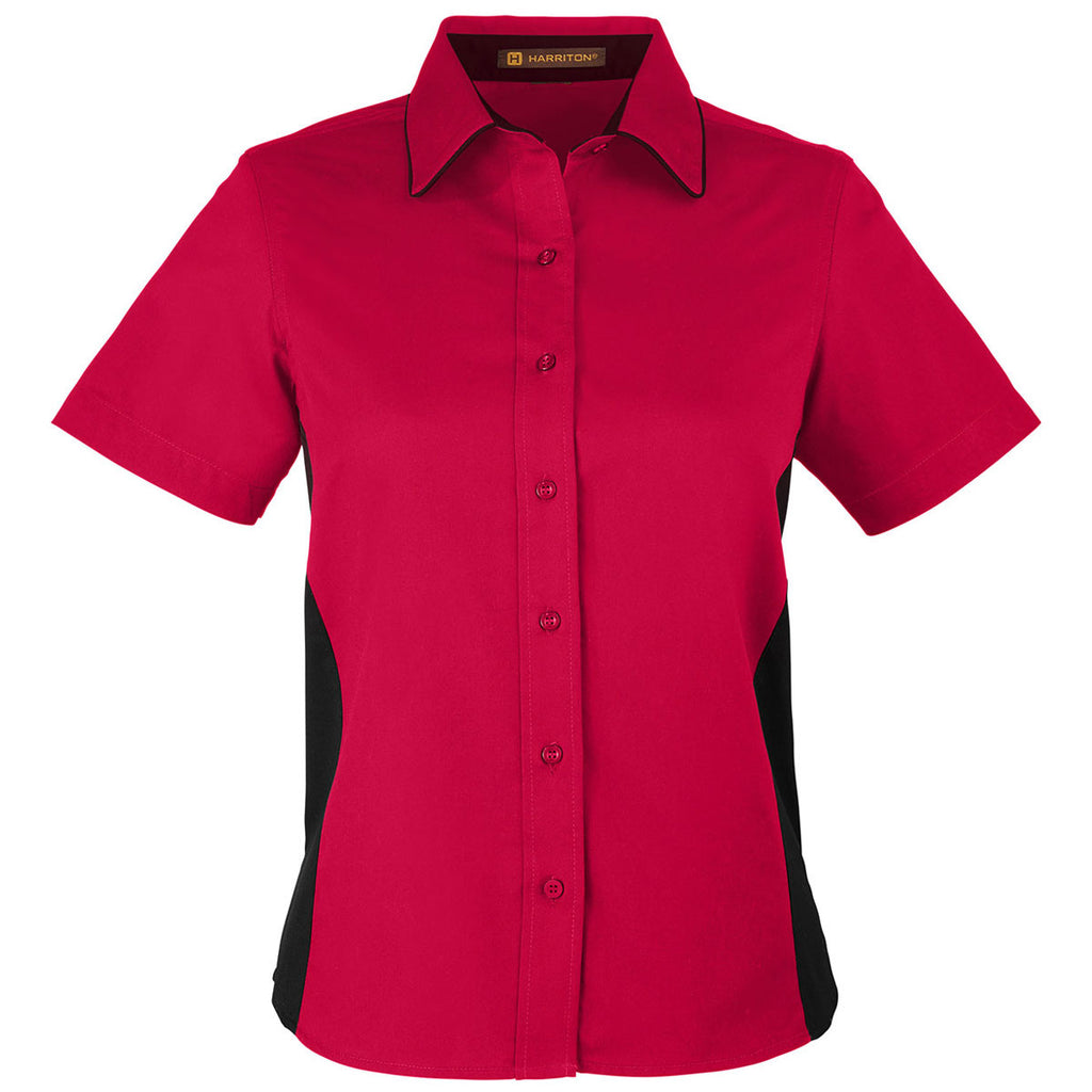 Get noticed in a custom Harriton Women's Red/Black Flash Colorblock Short Sleeve Shirt whether you are at work of play. Add a company logo to the colorfully styled shirt to use as employee apparel or a custom design to use as a custom gift for those dear to your heart. The cotton polyester twill blend is wrinkle resistant and offers stain release with contrast collar and side vent details that create a unique silhouette. Great for daily wear or to choose something special for an event. This short sleeve option would be great for serving staff, counter workers, or anyone who needs a casual look that still looks clean and put together.Corresponding Men's Style:Harriton Men's Red/Black Flash Colorblock Short Sleeve Shirt
