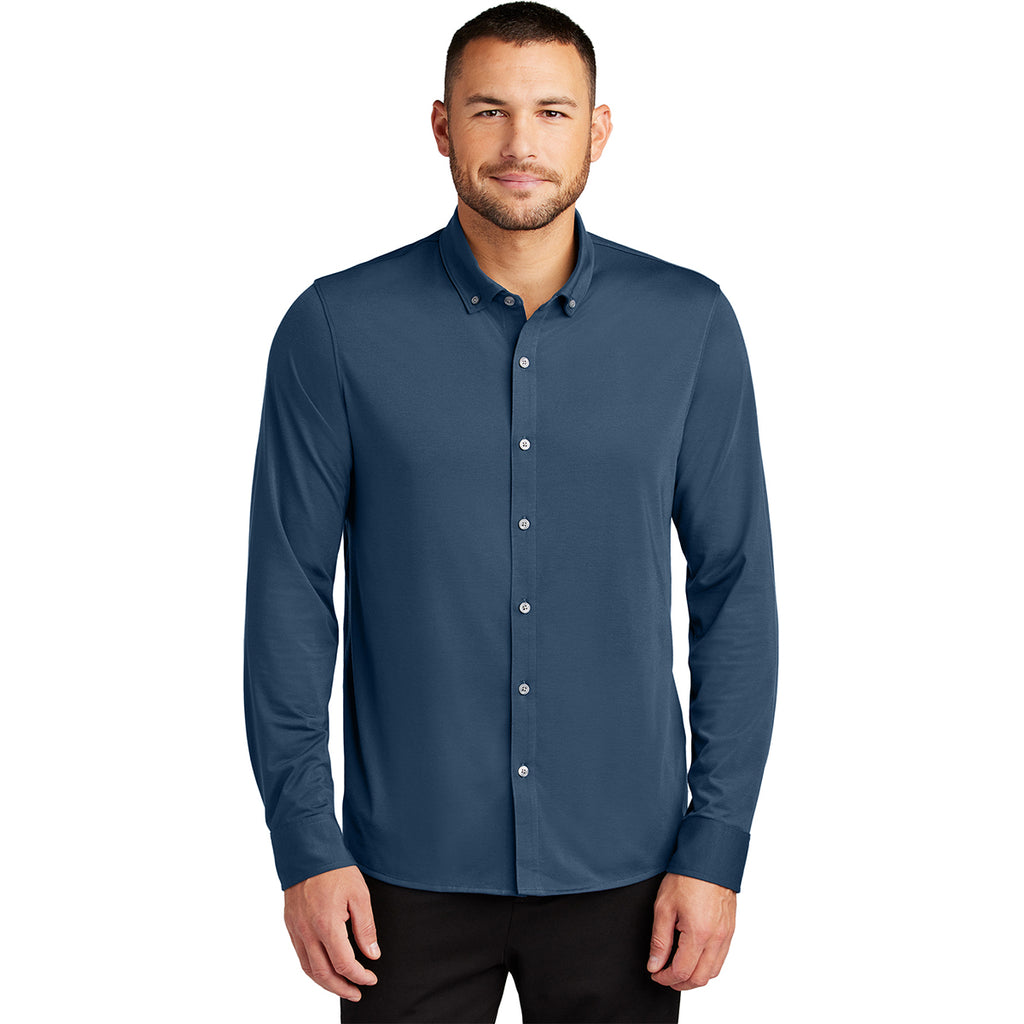 Upgrade your look with the Mercer+Mettle Men's Insignia Blue Stretch Jersey Long Sleeve Shirt with a corporate logo. The long-sleeve button up is perfect for the office but can transition easily to a night on the town. Made of lightweight jersey with stretch, this versatile shirt is a true must-have. Place an order right away.Highlights