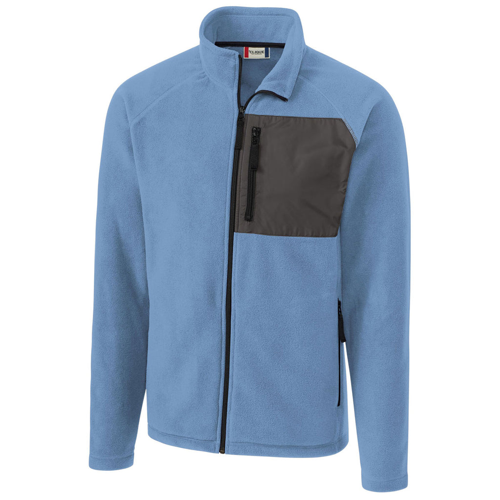 With a contrasting colored patch located on the left side of the Clique Men's Light Blue Summit Microfleece Hybrid Full Zip, you can expect professional peers to compliment your choice of company apparel at the next industry trade show. Make sure to attach your company logo on the right side of the chest for expanding the power of your unique brand. The decorative patch on the right side of the chest includes a zippered pocket where you gain quick access to your cell phone. Raglan sleeves turn the full zip jacket into outerwear that is ideal for active professionals.Corresponding Women's Style:Clique Women's Light Blue Summit Microfleece Hybrid Full Zip