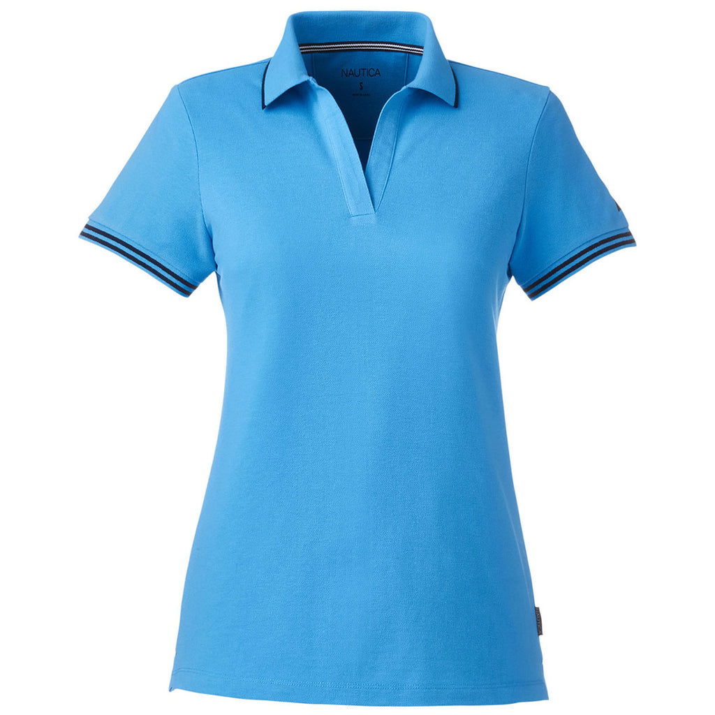Get noticed in a custom Nautica Women's Azure Blue Deck Polo made of a cotton and polyester blend for all day comfort wear. The simple polo has a flattering fit, but offers a little flair with striped tipping and neck tape. Add a company logo to use this as employee apparel or layer to use as more formal corporate apparel. A custom logo means this is great for an employee event in which certain people need to stand out like at a trade show or team building exercise. Relax on the back nine or at the clubhouse with this short-sleeve polo that will have you making deals and winning rounds.