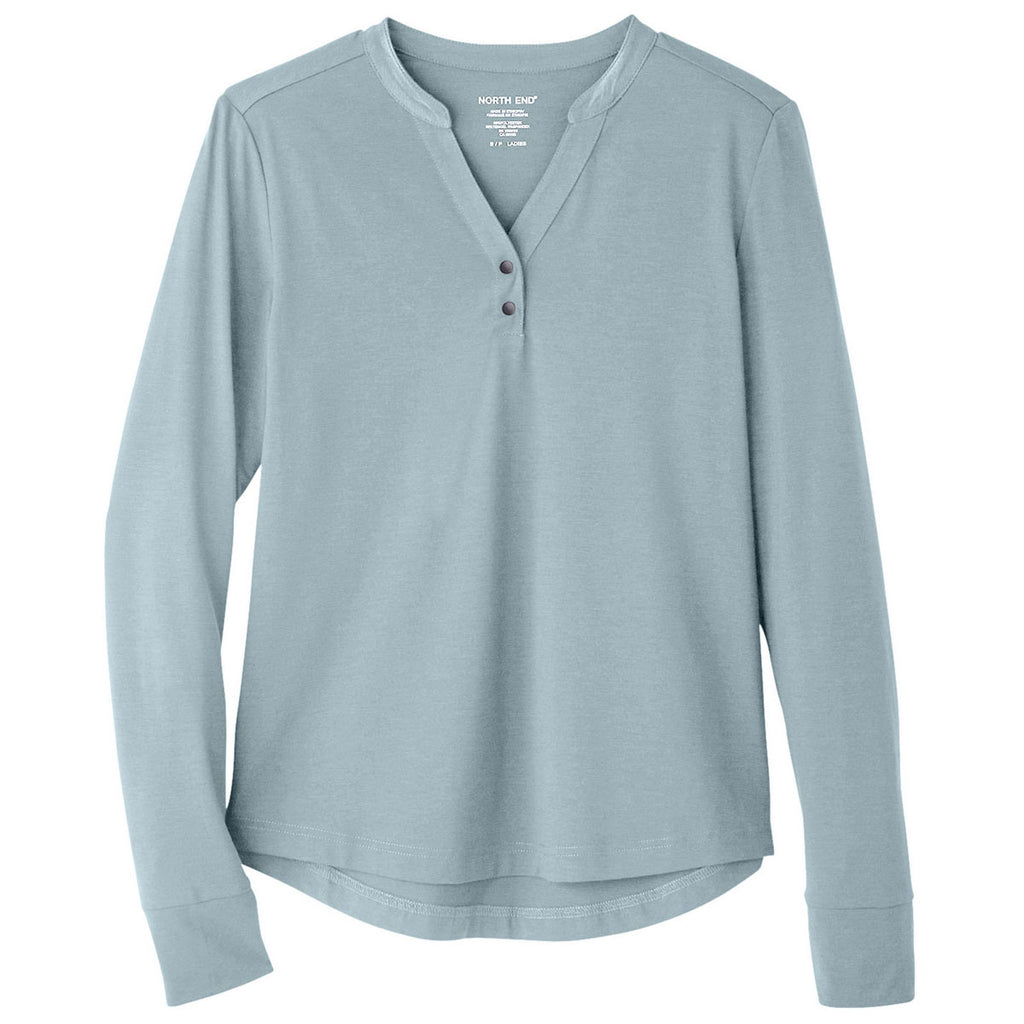 Look and feel great in a custom embroidery North End Women's Opal Blue Jaq Snap-Up Stretch Performance Pullover. The embroidery you choose will stand out on the polyester rich, lycocell, spandex jersey that is gorgeous when paired with a jacket, but is also perfect when hanging out with friends. The henley placket offers metal two snap closure for easy layering. The self-fabric cuffs with integrated thumbholes make this an option for working out because the hi-low hem provides extra coverage. Stretch performance, active fit, and easy care make this an all around pullover that all will appreciate.