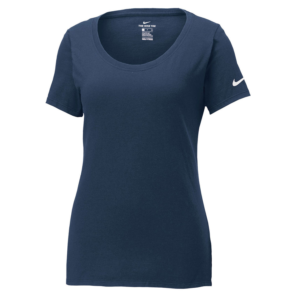 Before the next corporate sponsored golf tournament, order the stylish Nike Women's College Navy Core Cotton Scoop Neck Tee for all the female players competing in the event. Soft ringspun cotton ensures your company team remains comfortable all day long. The durable fabric resists rips and tears to give you go-to recreational apparel for years to come. Attach a custom printed logo to expand awareness of your brand around the community. Wear the versatile tee in the warmer months of the year, as well as the first layer when the temperatures drop.This product cannot ship outside of the United States.