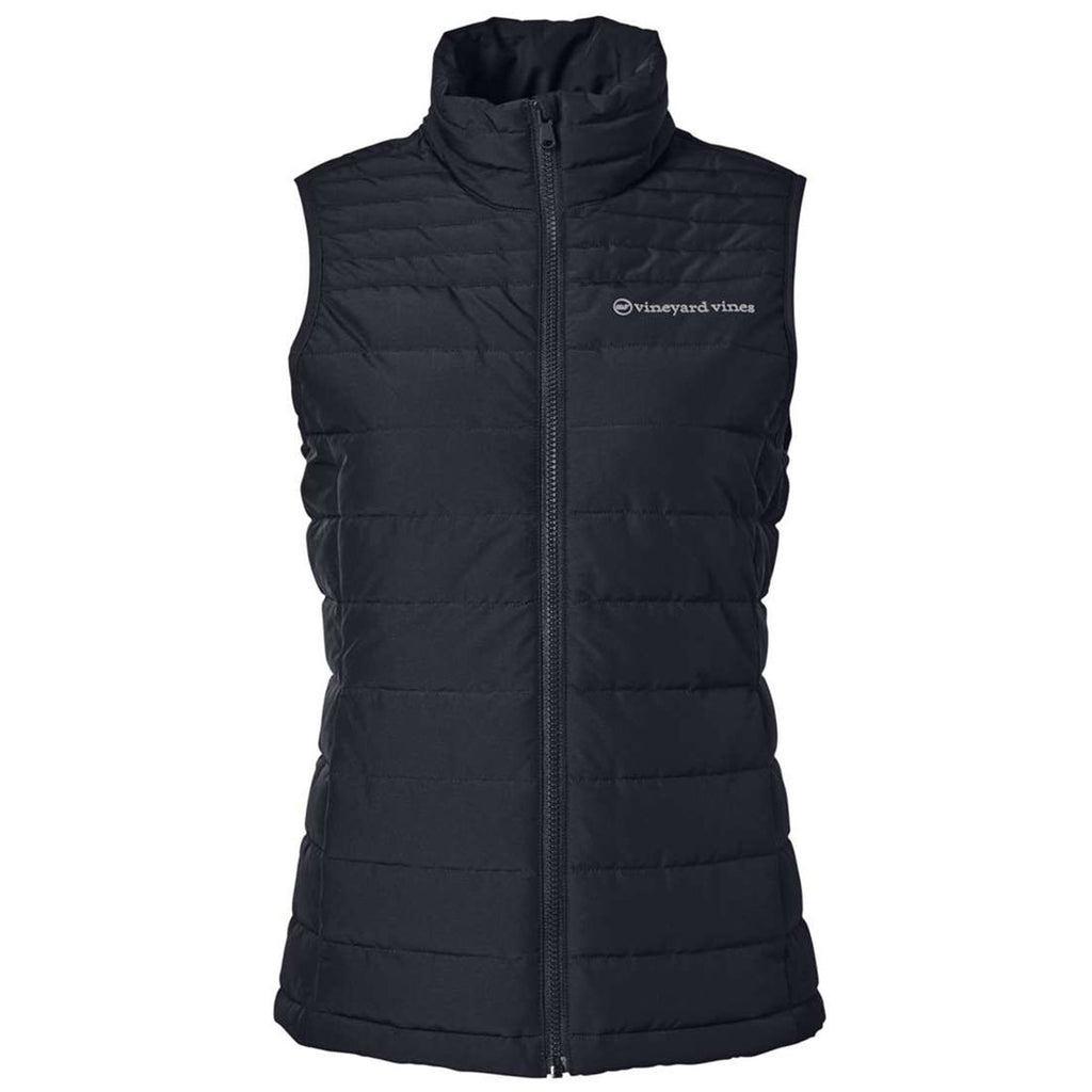 Layer in comfort with the Vineyard Vines Women's Jet Black Mountain Weekend Puffer Vest, a stylish staple with just the right amount of warmth. Its contoured fit, zippered front, and high-quality fabric make it ideal for custom branding, corporate giveaways, or travel gear that speaks elegance and practicality.