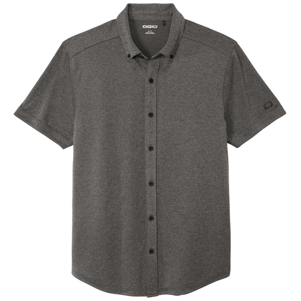 Choose an embroidery design for the OGIO Men's Dark Heather Grey Gravitate Full-Button Polo to create a unique look that can serve as corporate apparel during the day paired with a jacket and easily transition into after hours wear so you can hang out with friends. Add a custom logo for personal styling or add to your logoed apparel selections. The poly material has stay cool wicking technology with a modern, polished look. Choose a company logo for the short sleeved polo with button up front to use as employee apparel for a range of professions.