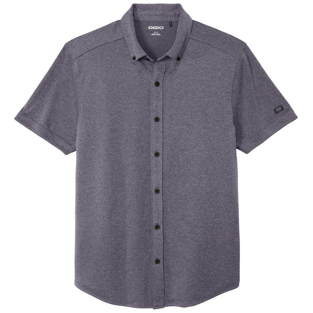 Choose an embroidery design for the OGIO Men's Navy Heather Gravitate Full-Button Polo to create a unique look that can serve as corporate apparel during the day paired with a jacket and easily transition into after hours wear so you can hang out with friends. Add a custom logo for personal styling or add to your logoed apparel selections. The poly material has stay cool wicking technology with a modern, polished look. Choose a company logo for the short sleeved polo with button up front to use as employee apparel for a range of professions.