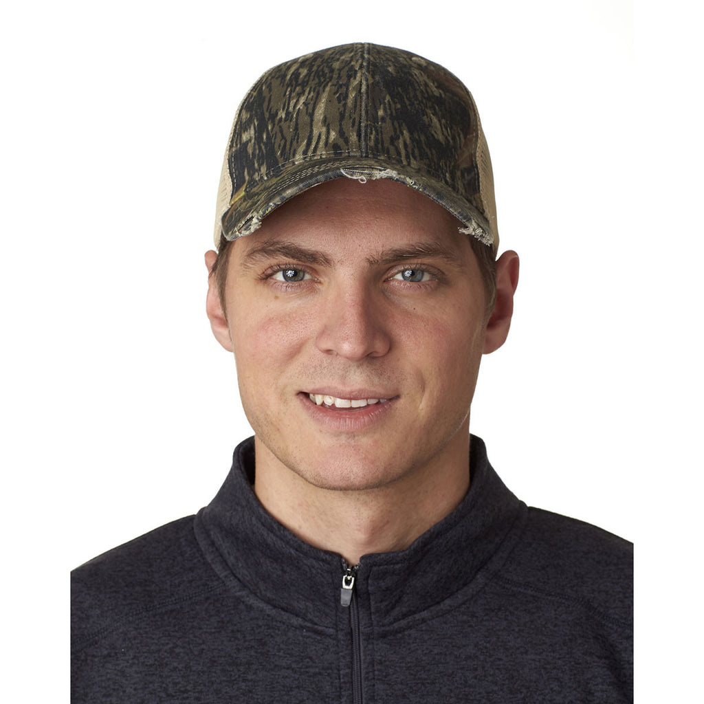 Let's be honest: it doesn't really look like a true trucker cap unless it's a little distressed. Sun-beaten. Wind-worn. This Adams Men's Hardwoods/Camo 6-Panel Pigment-Dyed Distressed Trucker Cap has that authentic look that's perfect to represent the hard-nosed logo you've created. And with 100% cotton on the front panel and visor, you'll find plenty of comfort in representing that hard-nosed brand no matter where you go; and if you use this cap as a way to promote your event or simply to give away as prizes, people will enjoy doing exact same thing. Features a distressed/torn visor for a "rough" but stylish look.Highlights