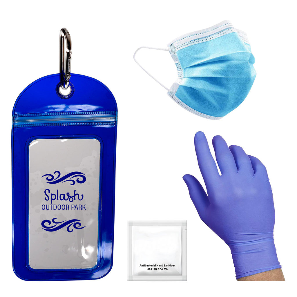 - PVC water-resistant pouch packed with single use gel sanitizer packet, 3 layer face mask and pair of gloves.