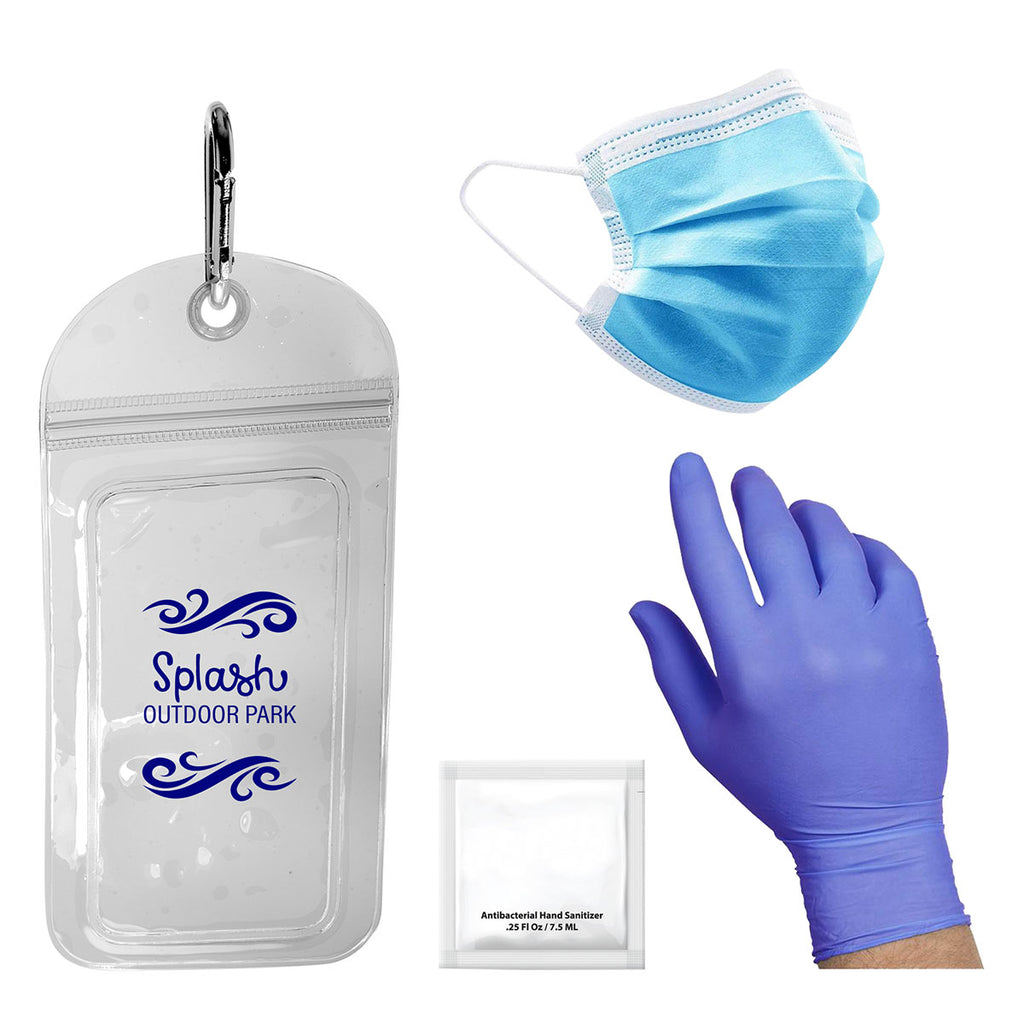 - PVC water-resistant pouch packed with single use gel sanitizer packet, 3 layer face mask and pair of gloves.