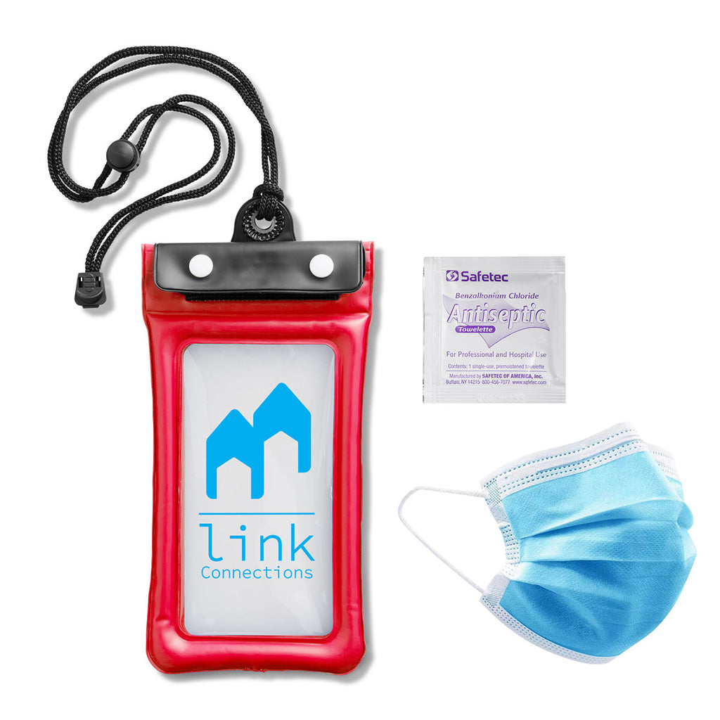 Stay protected on the go or at home with these safetyPrimeline Red Mobile Personal Protection Kits. Kit comes packed in a pouch and includes a 3-layer face mask and an alcohol-free antiseptic wipe - the pouch features a breakaway lanyard, so you can use it to protect your smartphone or any small device from water and germs. Put your employees' safety in the workplace first - fashion back to work safety kits out of these packs!