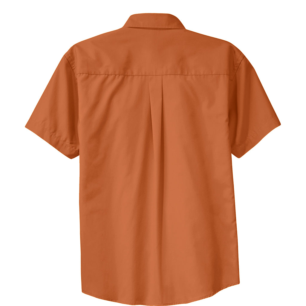 A short-sleeve button-down made for the workday but professional enough for upscale events? No, you're not dreaming: that's actually an apt description for Port Authority Men's Texas Orange/Light Stone Short Sleeve Easy Care Shirt. The 4.5-ounce, 55/45 cotton/poly blend fabric is perfect for breathing, while the button-down collar ensures that your employees will always be event-appropriate. The patch pocket scores points for function as well as dressiness, and the dyed-to-match buttons are as subtle as they are necessary. And if you ask us, a good work shirt should be understated, allowing your own corporate embroidery and custom business logo to earn the attention.Corresponding Women's Style: Port Authority Women's Texas Orange/Light Stone Short Sleeve Easy Care Shirt