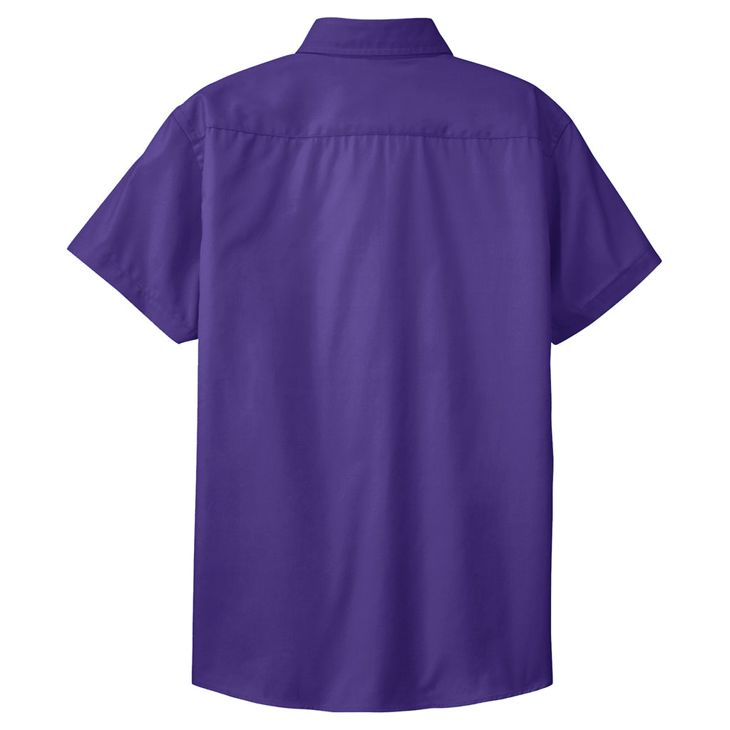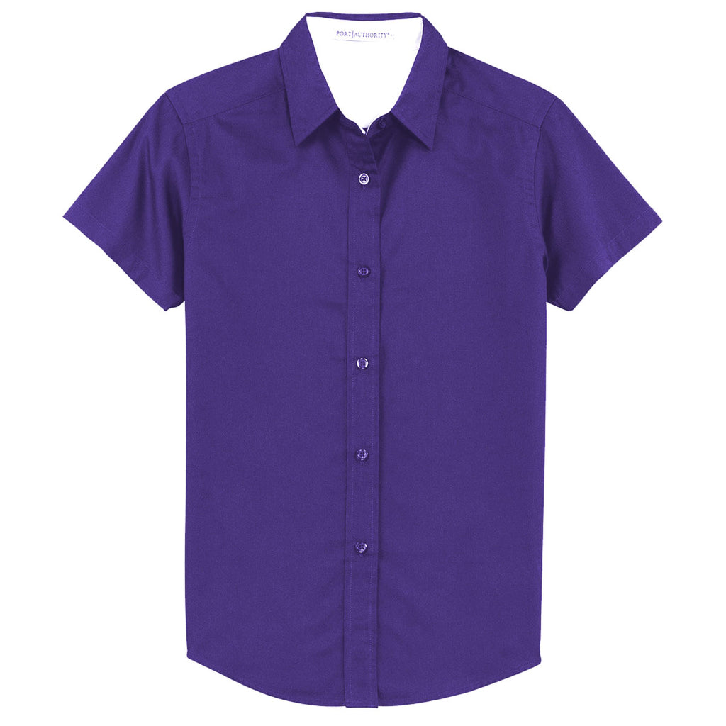Want an employee uniform that looks good no matter the occasion or what hour of the shift you're on? Then allow us to introduce you to the Port Authority Women's Purple/Light Stone Short Sleeve Easy Care Shirt. Not only is this shirt lightweight (4.5 ounces), but it's breathable, thanks to a 55/45 cotton/poly blend. The traditional, relaxed look is thanks to the open collar and dyed-to-match buttons that steal none of your own custom embroidery or corporate logo's thunder. And the shirt is easy enough to care for and maintain that your employees will have no problem wearing it more than once a week.Corresponding Men's Style: Port Authority Men's Purple/Light Stone Short Sleeve Easy Care Shirt