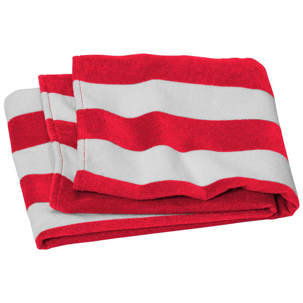 Hit the beach or lay out by the pool in a custom embroidered Port Authority Red Value Cabana Stripe Beach Towel. The bright stripes on this large 30 x 60 inch towel will stand out with your company logo embroidered in the perfect location. Made of 100% USA cotton terry velour, fully hemmed, and with fade resistant stripes this towel makes the perfect employee gift or end of the year gift for those you care for in life. Place an order for several to use at team events for those participating in swim meets or any outdoor activity as additional ground seating. The possibilities are endless for these useful towels.Highlights