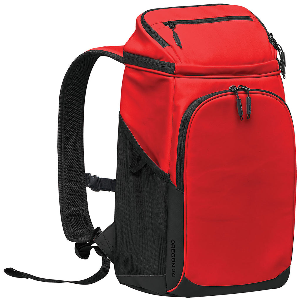 Choose print for the Stormtech Red/ Black Oregon 24 Cooler Backpack to make sure you can easily identify this practical backpack cooler with classic style. The durable, waterproof backpack is ready to be spontaneous with a spacious main compartment and an extra side compartment that is perfect for your tablet. A front pocket is ideal for a phone and keys as you enjoy your day at the beach or picnicking after a hike. Add a company logo to give as employee gifts or promotional products that everyone will want. When carrying, adjust the ergonomic shoulder straps and enjoy the airflow padded back panel that will make you even more comfortable.