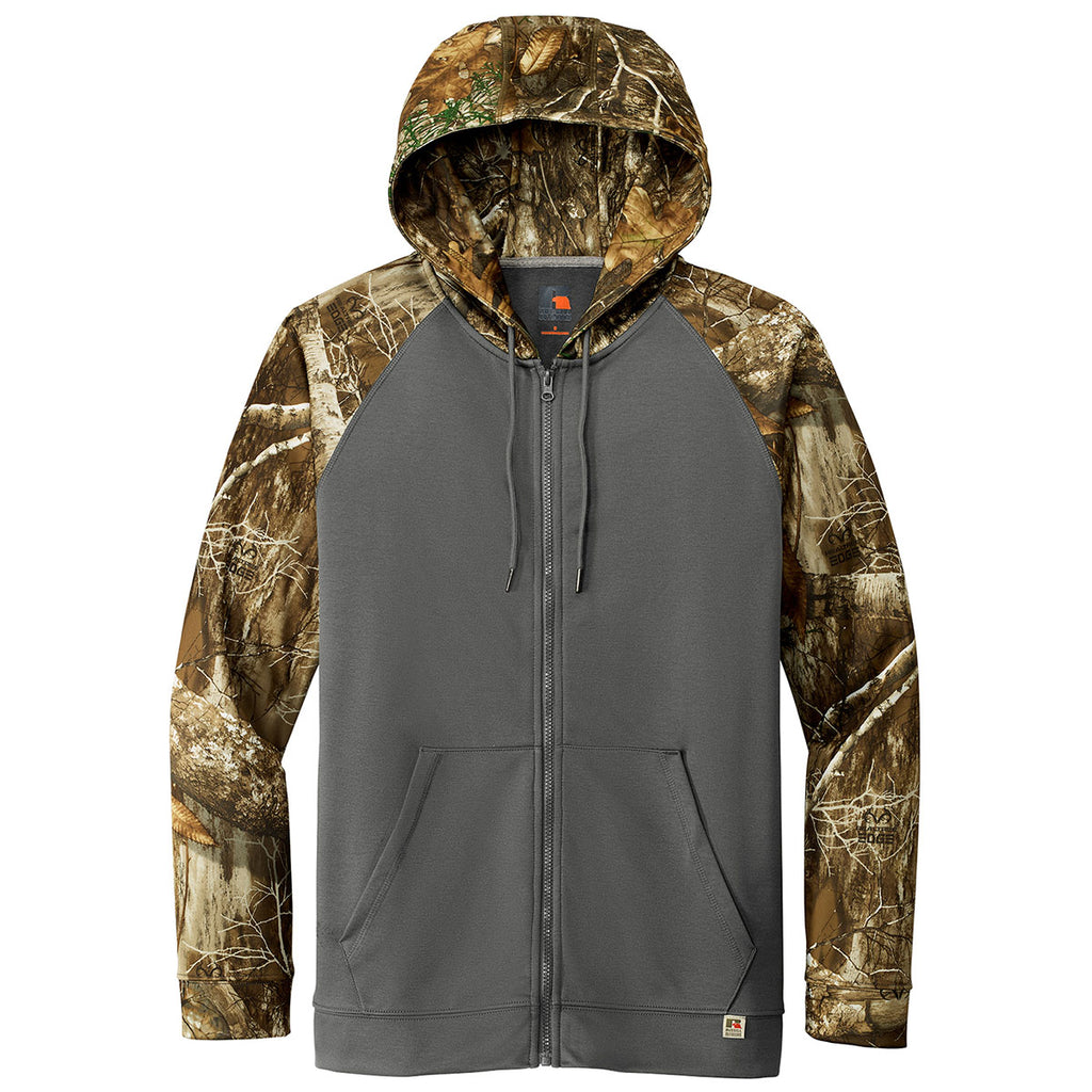 Comfortable and incredibly easy to wear, the Russell Outdoors Men's Magnet/ Realtree Edge Realtree Performance Colorblock Full Zip Hoodie will show off your company's custom logo or design while also protecting your team from the elements. It's also made from a moisture-wicking fabric so it's great for anyone with an active lifestyle.