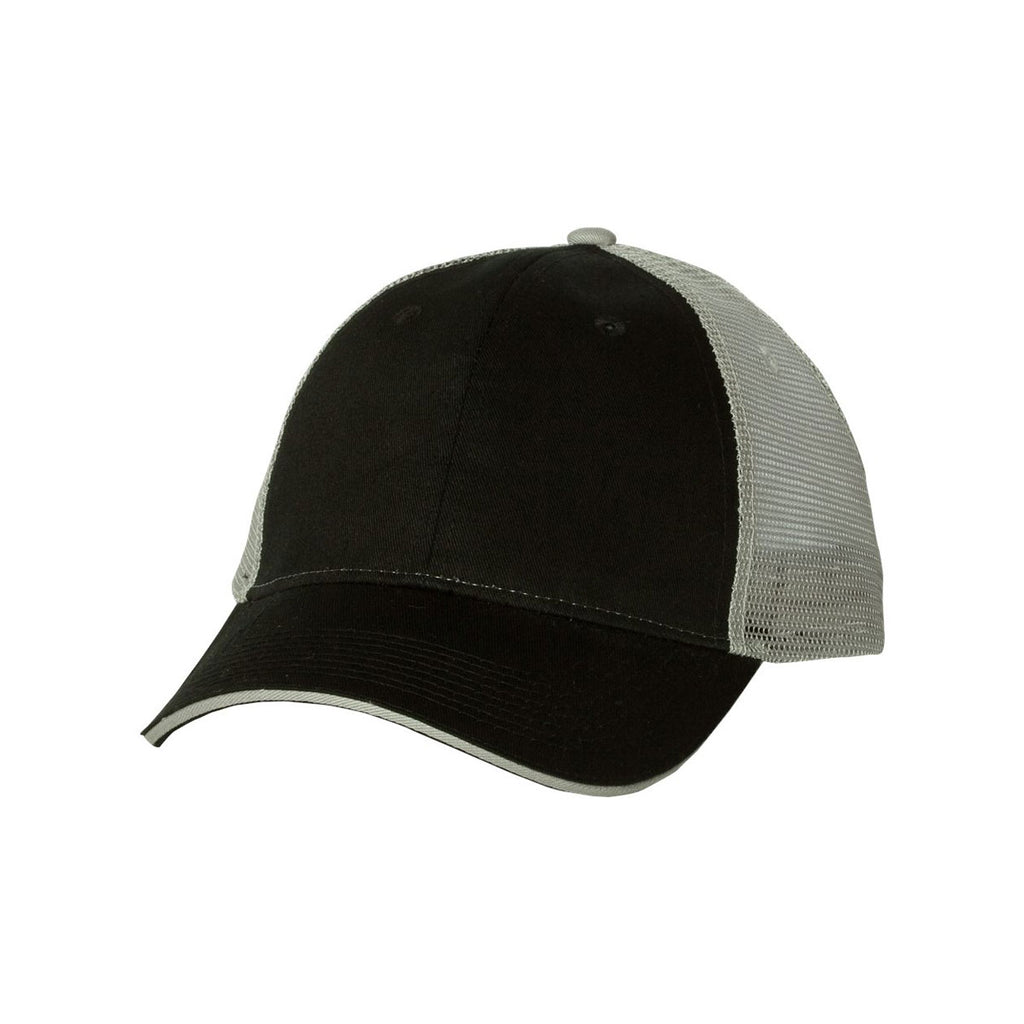 When you need headwear for a long trek cross country, put on the custom logoed Valucap Black/Grey Sandwich Trucker Cap. Designed with a cotton and polyester blend, the super soft cap resists rips and tears to keep the headwear in pristine condition for years to come. One-hundred percent polyester mesh in the back of the hat helps circulate air to keep you comfortably cool. Structured six panels present a professional appearance for customers who apply their skills outdoors. The mid profile design keeps the sun out of your eyes during corporate softball games. Attach your company logo to get the word out about your products and services.Highlights