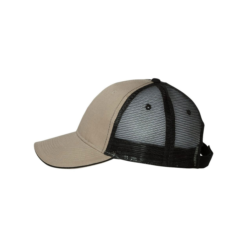 When you need headwear for a long trek cross country, put on the custom logoed Valucap Khaki/Black Sandwich Trucker Cap. Designed with a cotton and polyester blend, the super soft cap resists rips and tears to keep the headwear in pristine condition for years to come. One-hundred percent polyester mesh in the back of the hat helps circulate air to keep you comfortably cool. Structured six panels present a professional appearance for customers who apply their skills outdoors. The mid profile design keeps the sun out of your eyes during corporate softball games. Attach your company logo to get the word out about your products and services.Highlights
