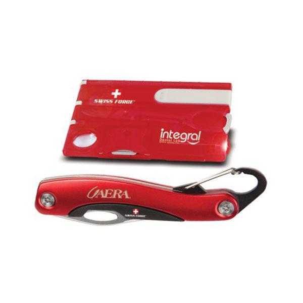 With multiple locations for your printed custom logo, the Swiss Force Red Variety Pack is a great choice for your next promotional giveaway or corporate gifting occasion. The multi-tool and utility knife set is practical and functional and made with high-standards that ensure years of use.