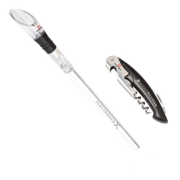 For a unique company gift with your company logo, look no further than the Swiss Force Black Wine Expertise gift set. It includes wine tools as well as a steel cooling rod with attached pourer for serving perfectly chilled wine. A classy employee and valued client recognition gift, it comes individually boxed for that extra special touch.