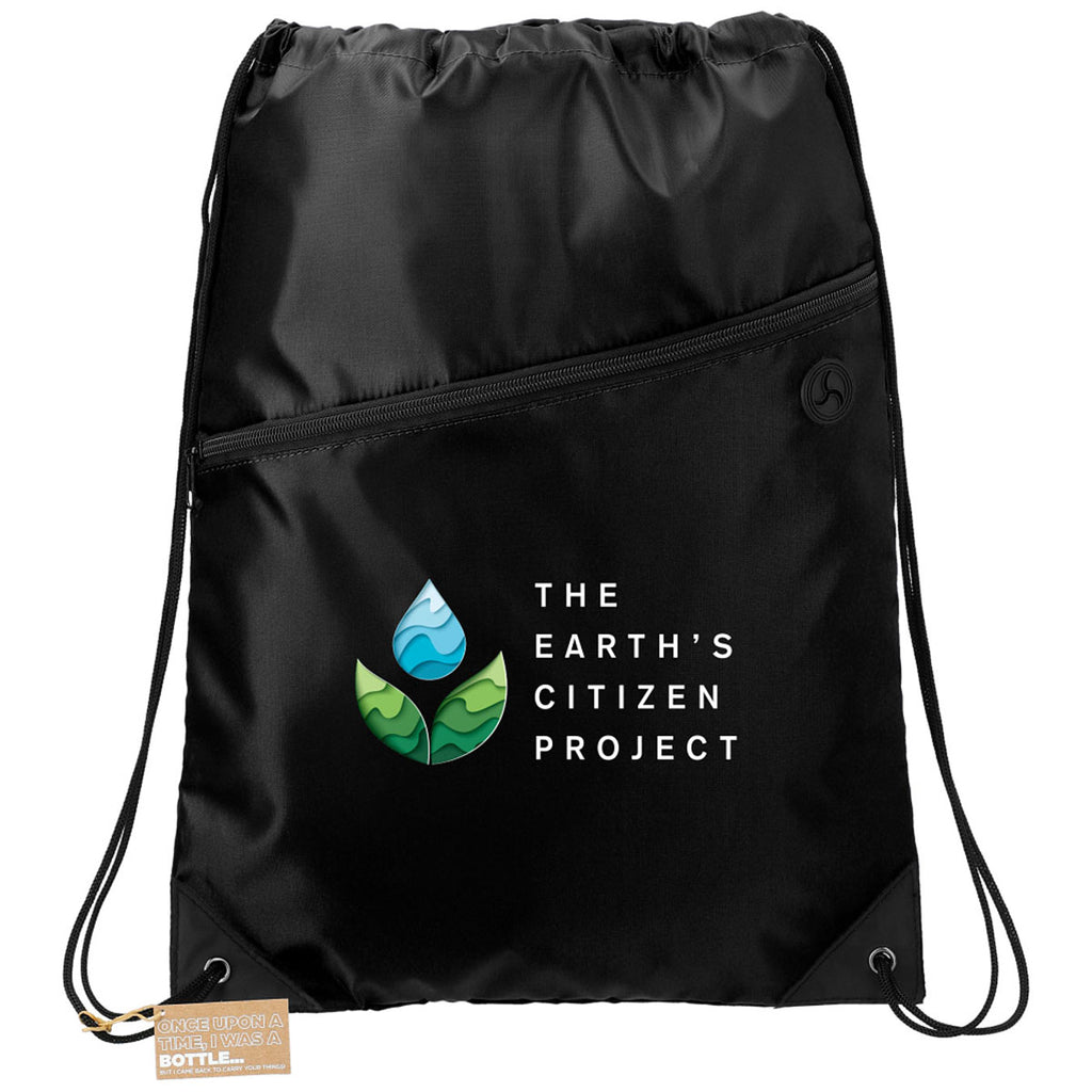 - The Robin RPET Drawstring Bag has a large main compartment with a cinching rope closure. The zippered front pocket also features an earbud port and reinforced corner tabs. This bag is manufactured from 100% recycled 210d polyester, made from water bottles. Through a partnership with 1% For The Planet one percent of sales of this and all EcoSmart products will be donated to nonprofits dedicated to protecting the planet.