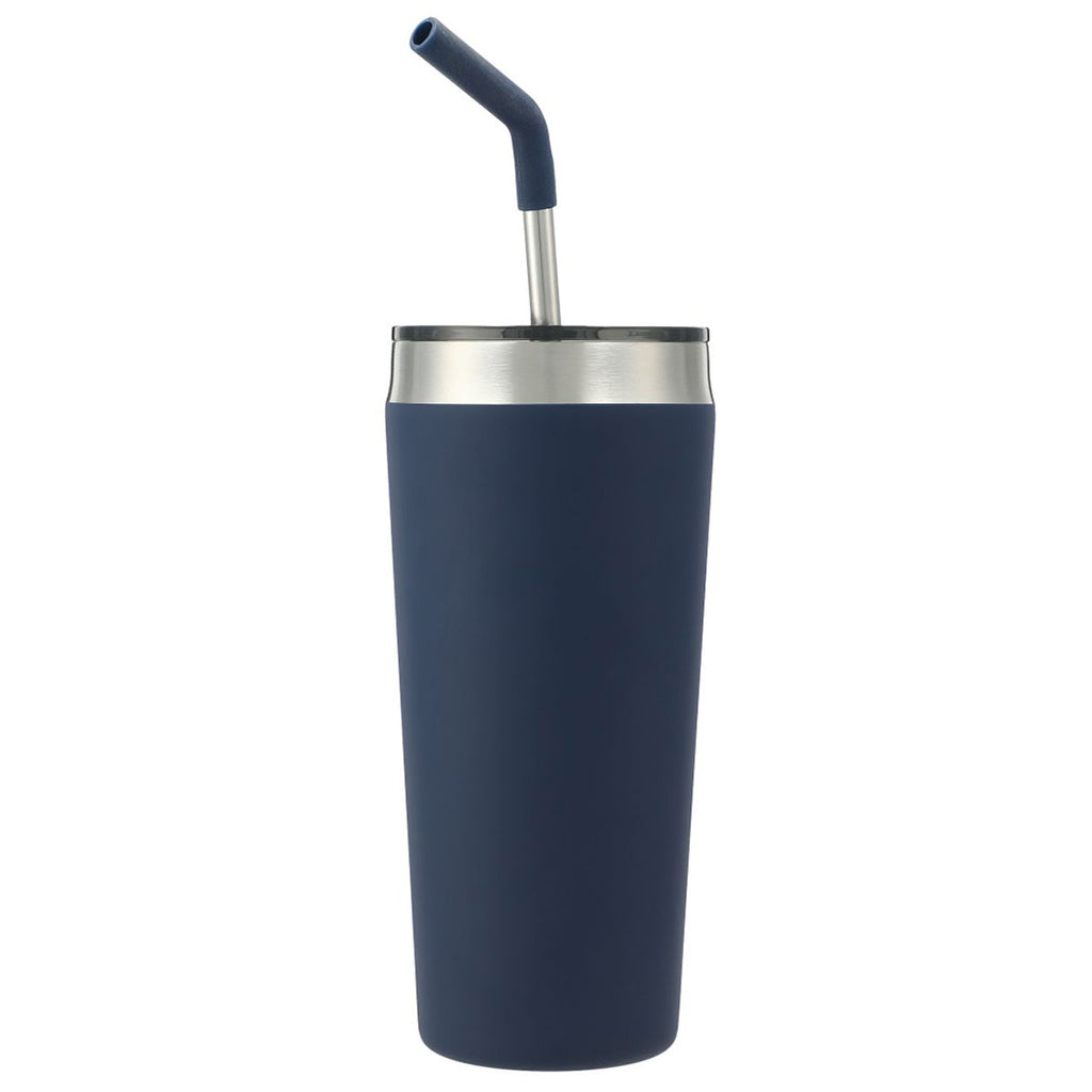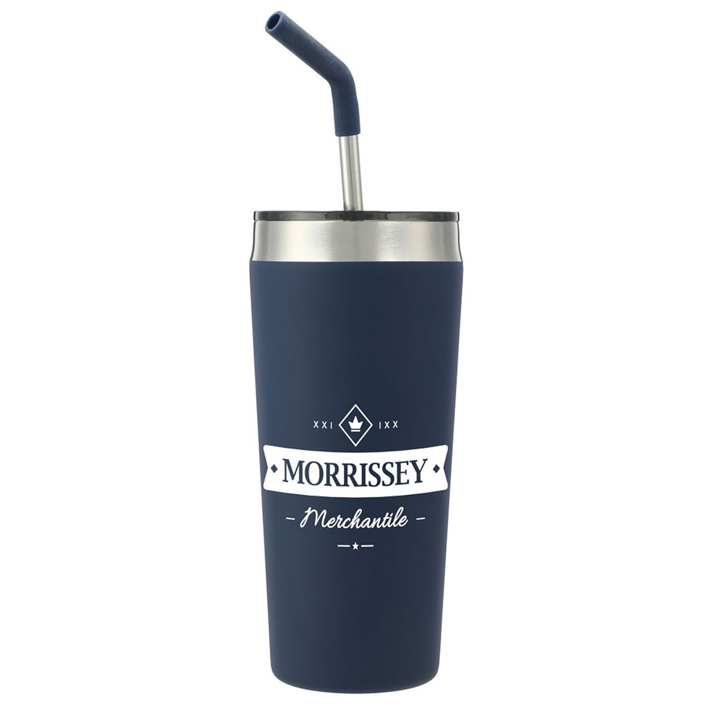 The Bullet Navy Faye 20oz Vacuum Tumbler w/ SS Straw features double-wall stainless steel construction with vacuum insulation. Use it to keep your favorite beverages hot for five hours or cold for 15 hours. It has a food-grade stainless steel straw with a comfortable removable silicone tip for safe sipping. The spill-proof press-on lid, offers a slide closure. Reusable and dishwasher-safe, the included straw is an eco-friendly, environmentally responsible, and sustainable alternative to disposable plastic straws. Oder a sustainable and affordable drinkware option and add a custom-printed logo on the front.