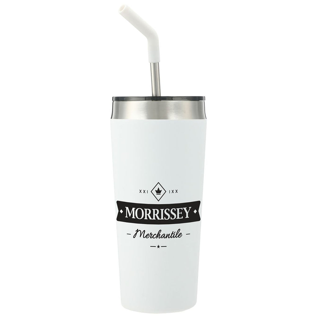 The Bullet White Faye 20oz Vacuum Tumbler w/ SS Straw features double-wall stainless steel construction with vacuum insulation. Use it to keep your favorite beverages hot for five hours or cold for 15 hours. It has a food-grade stainless steel straw with a comfortable removable silicone tip for safe sipping. The spill-proof press-on lid, offers a slide closure. Reusable and dishwasher-safe, the included straw is an eco-friendly, environmentally responsible, and sustainable alternative to disposable plastic straws. Oder a sustainable and affordable drinkware option and add a custom-printed logo on the front.