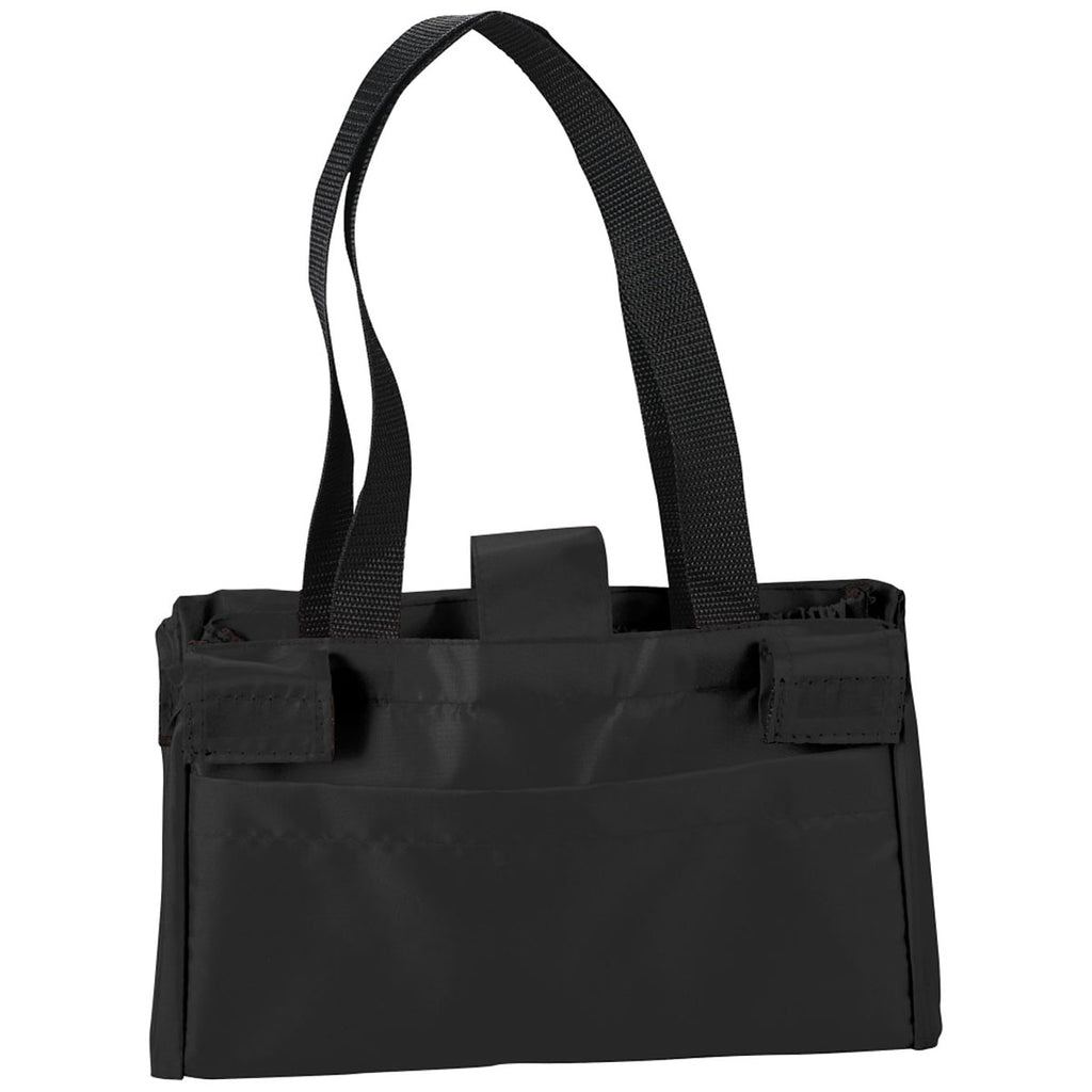 Stay safer with the custom logo Bullet Black Over The Cart Grocery Tote. This tote features durable plastic side bars with an elastic top that stretches to fit over most grocery carts to keep you protected from germs. Simply fill your tote with groceries, pay and go. The tote can be lifted out of the cart with its durable carry handles. An open slash pocket is perfect for coupons and personal belongings as you shop. The nylon material is easy to wipe down and a Velcro top flap helps fold up the tote when not in use. Great as an event giveaway or to sell at a trade show with your custom logo. Place an order today.The minimum order for this product is 100 pieces.