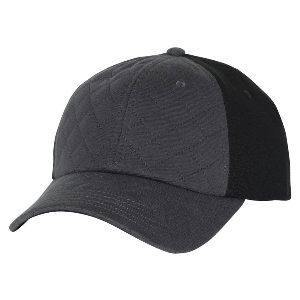 Make a bold statement with the Sportsman Grey/Black Quilted Cap with added embroidery in your design of choice. The unique look of this 100% cotton cap will stand out with any outfit and for most any occasion. The quilted look of the soft-structured, six panel cap draws the eye right to where your company logo or corporate embroidery will be placed. A darker back panel adds to the illusion of this cap that will be an instant favorite. The pre-curved visor with black undervisor to protect the face and eyes is great whether in the rain, snow, or sun. A plastic tab closure creates a one size fits most cap that make for great employee gifts or items that will fly off the shelves.Highlights
