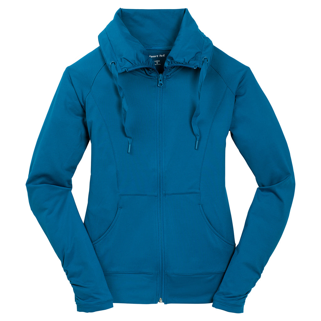 Just because it's jacket weather doesn't mean you have to bundle up to the nines. Enter the Sport-Tek Women's Peacock Blue Sport-Wick Stretch Full-Zip Jacket. This jacket is light, and we do mean light: the 6.8-ounce, 90/10 poly/spandex fabric is lighter than many pullovers. In fact, this jacket goes so far as to offer a tag-free label and a zip-through cowl collar to offer the most insulation possible in a light jacket. With the ruching at the cuffs, the self-fabric hem, and the raglan sleeves, you'll look as stylish as ever even while feeling so comfortable you may just forget you have a jacket on in the first place. All that remains? Your company's logo embroidered on the front to turn this into a sleek piece of workwear.