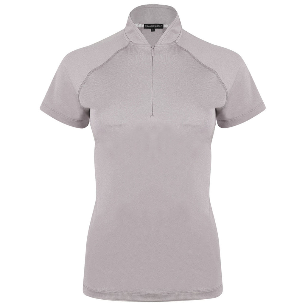 Swannies Golf Women's Grey Quinn Polo with a custom logo is the updated style any woman can love. The hidden zipper mock neck adds a bit of style to the polo, whether practicing your backswing, hitting the range, or hanging out with friends. Full stretch allows you to move in any way you need to play your best. Place an order today.