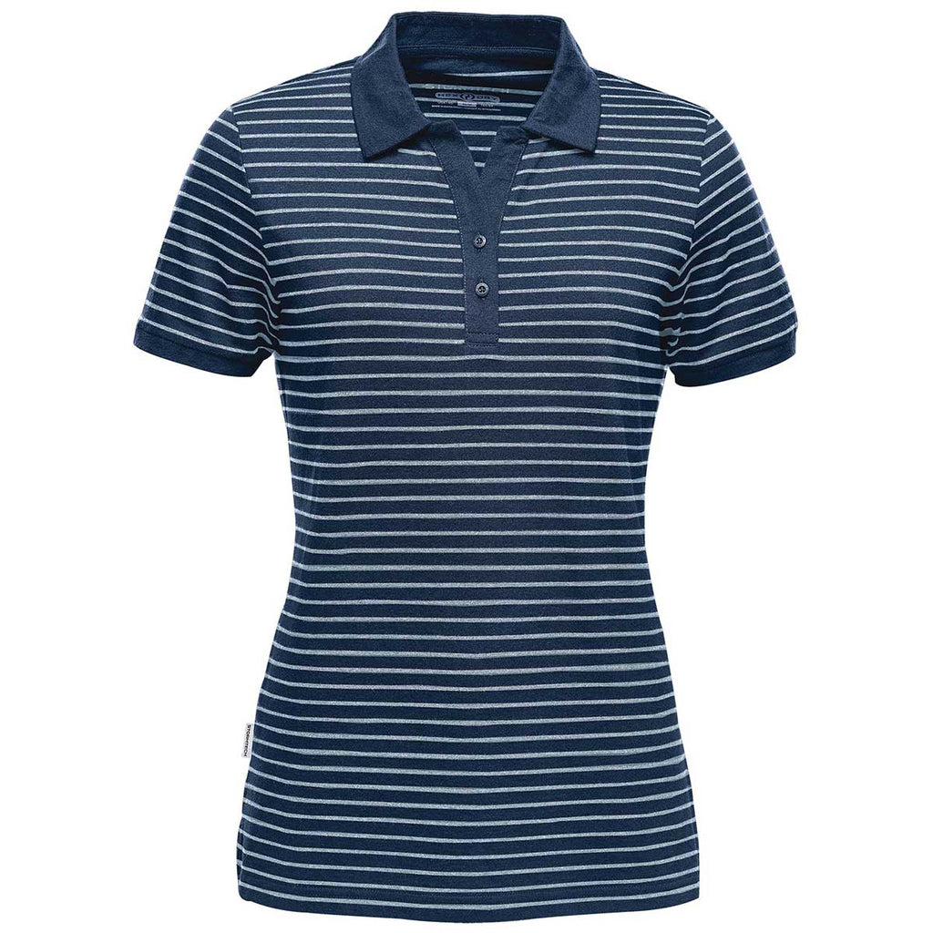 Add embroidery to the Stormtech Women's Navy/White Railtown Polo to spice up the trendy classic that will never go out of style. This go to summer basic if versatile and proper for numerous settings whether a company outing or as employee apparel. The contrast collar, cuffs, and hem slits add to the preppy style that can be dressed up or down depending on your destination. Add a custom logo to promote an event or company when needed. The simple stripes truly draw the eye and the flattering fit looks good on most anyone.Highlights