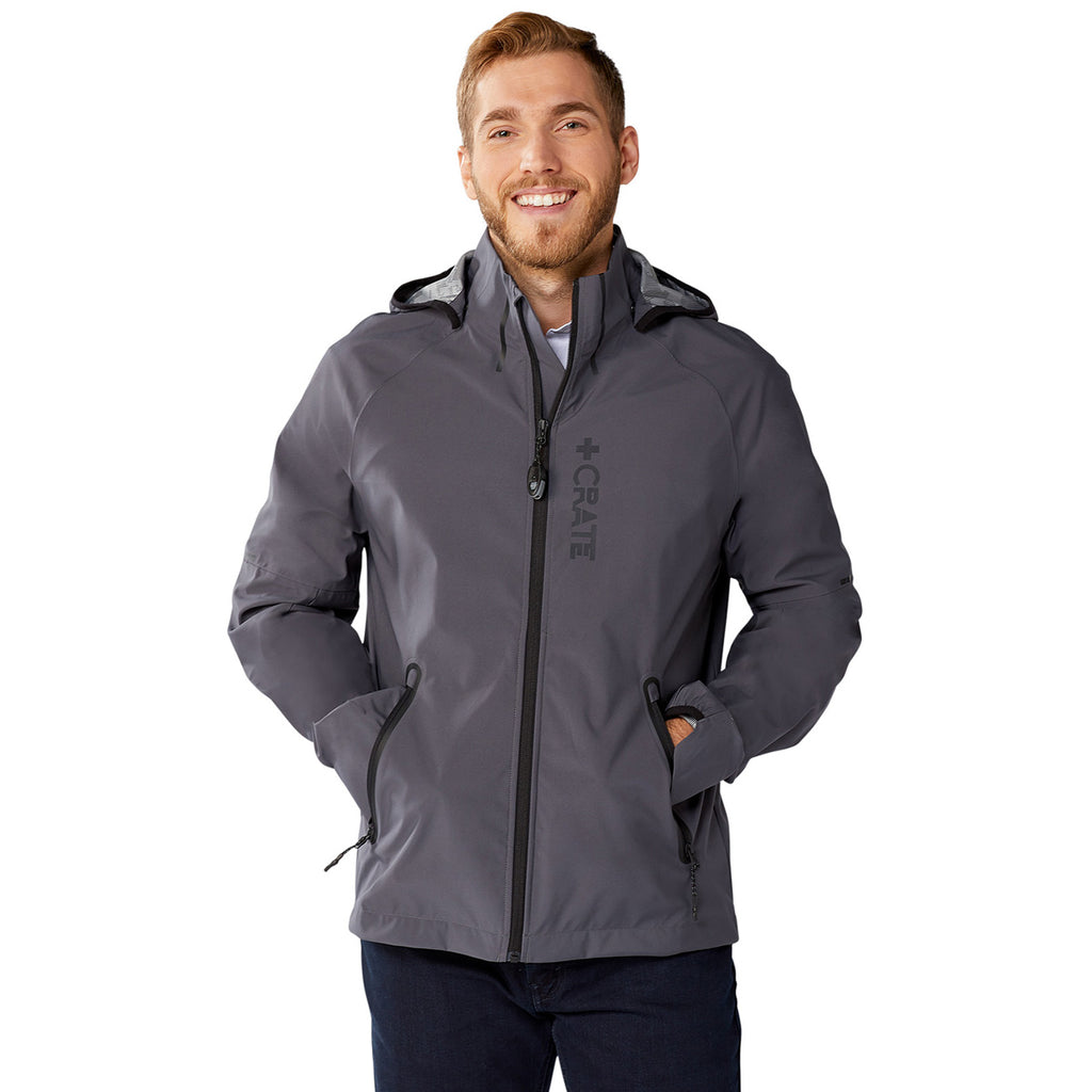Elevate your look with a custom Elevate Men's Grey Storm Oracle Softshell Jacket, the jacket that can be worn anywhere. This gorgeous jacket is made of 100% polyester bonded to a polyester graphic pattern knit that is waterproof and breathable. The lightweight construction makes this ideal for hiking, biking, or commuting to work. A graphic camo pattern interior adds a bit of extra style with an interior zippered pocket with key hook. Add a company logo to use as part of employee apparel or gifts for any occasion. The snap off hood even keeps you dry if the weather takes a turn for the worse.Corresponding Women's Style:Elevate Women's Grey Storm Oracle Softshell Jacket