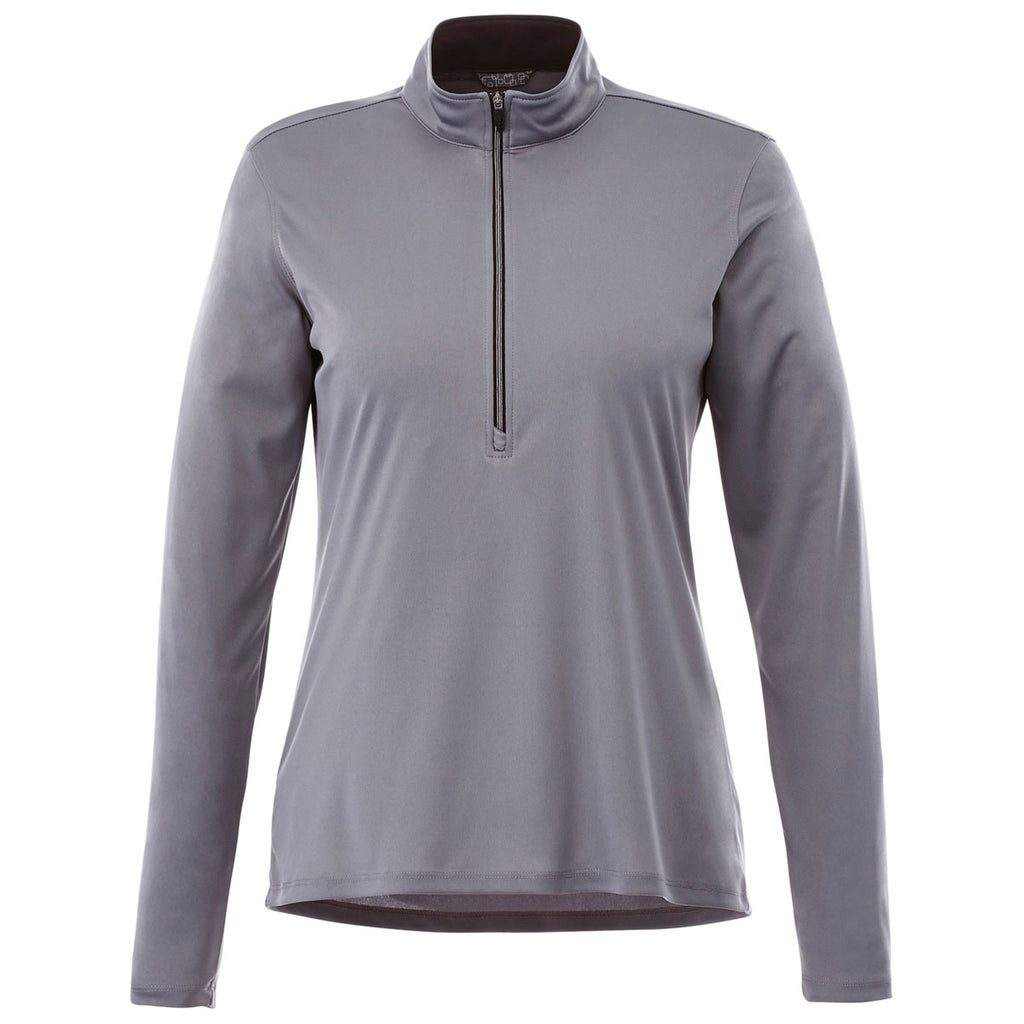 The Elevate Women's Steel Grey Vega Tech Half Zip with your custom logo is a perfect gift for your loyal female employees. It has a stylish professional look and it features a lightweight breathable but moisture wicking fabric. This fabric has UV protection and resists snagging so it is ideal for sunny days. This piece of wardrobe is designed for wash-and-wear convenience and therefore makes a perfect gift for every modern woman. Because of its versatile look, your employees will gladly wear it not only for corporate events but during their everyday activities. Let your employees know they are appreciated with this half zip.Corresponding Men's Style:Elevate Men's Steel Grey Vega Tech Quarter Zip