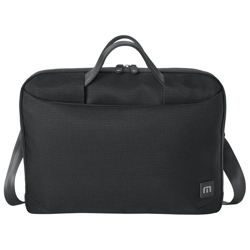 TravisMathew Black Lateral Brief has a corporate logo and high-performance accessory designed for practicality and style. Made from durable materials, it provides a sleek and modern look while ensuring ample storage space for essentials. Whether commuting to work or traveling, this briefcase offers versatility and sophistication in one well-crafted design.