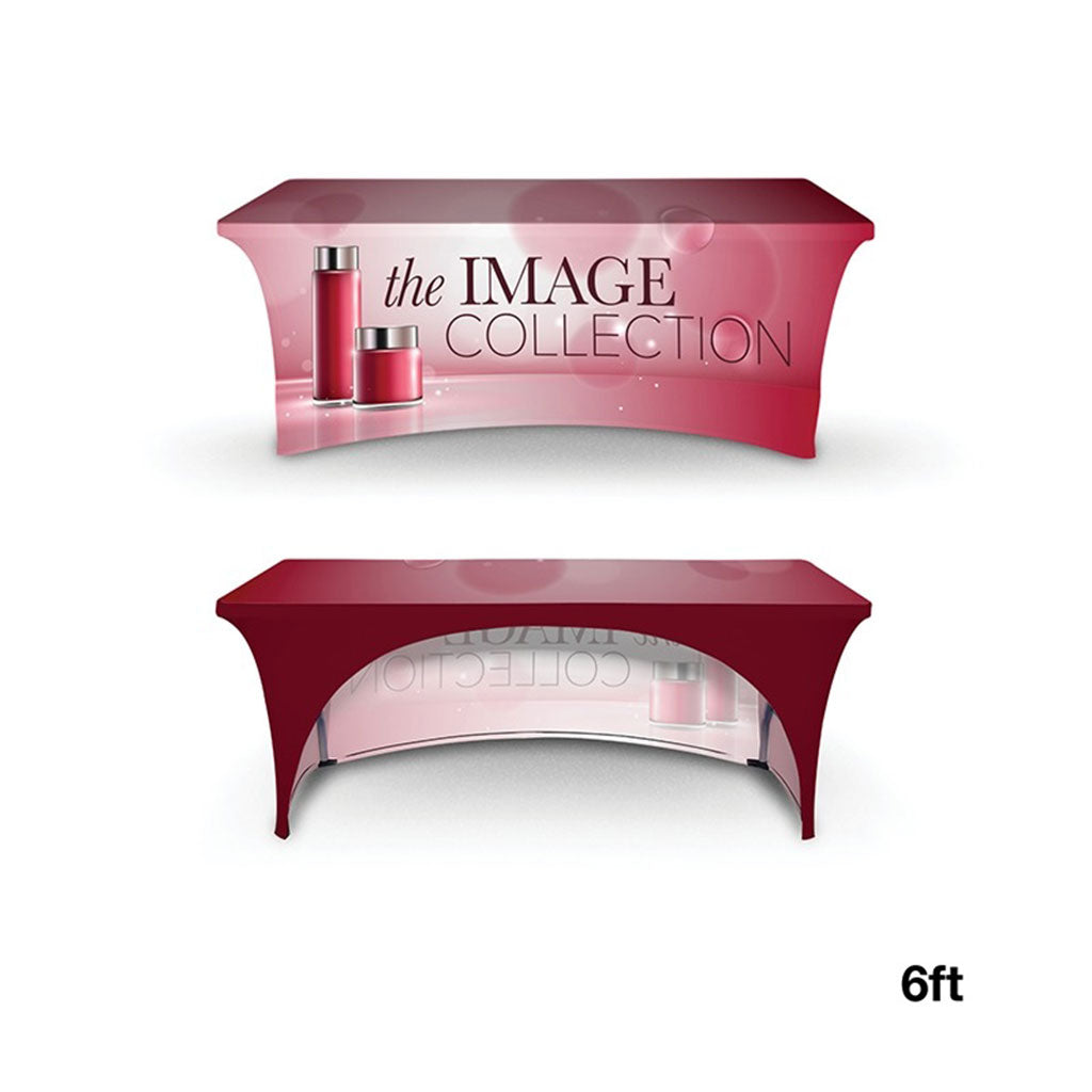 A fully custom printed DisplaySplash Multi-Colored 6' Stretch Open Back Table Cover is ideal for promoting your brand at trade shows, exhibitions, and presentations. Machine washable and fire-retardant-treated for convenience. It is highly elastic and has rubber feet for the table legs, creating a clean tight fit. This 3-sided table cover leaves the back open for you to rest your legs and easily access items underneath your table. Carry this table cover in its PVC zippered carrying bag.