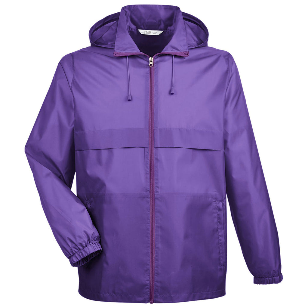 Protect your outdoorsy team from the elements with this customizable jacket. Finished with your an embroidery of your company logo, Team 365 Men's Sport Purple Zone Protect Lightweight Jacket helps your team to fight off the elements with its water-resistant finish all while increasing visibility of your brand. It features elasticized cuffs and a smooth zipper that runs all the way to the waist. The jacket also gives you the option of detaching the hood to suit your needs while its secure zippered pockets keep essentials handy on the go. Adjustability at the hem and hood help to customize the protection required for unexpected showers. It makes a great all-season corporate gift item for executives, company employees in outdoors niches such as construction, food delivery, landscaping, EMTs, firefighters and police.Highlights