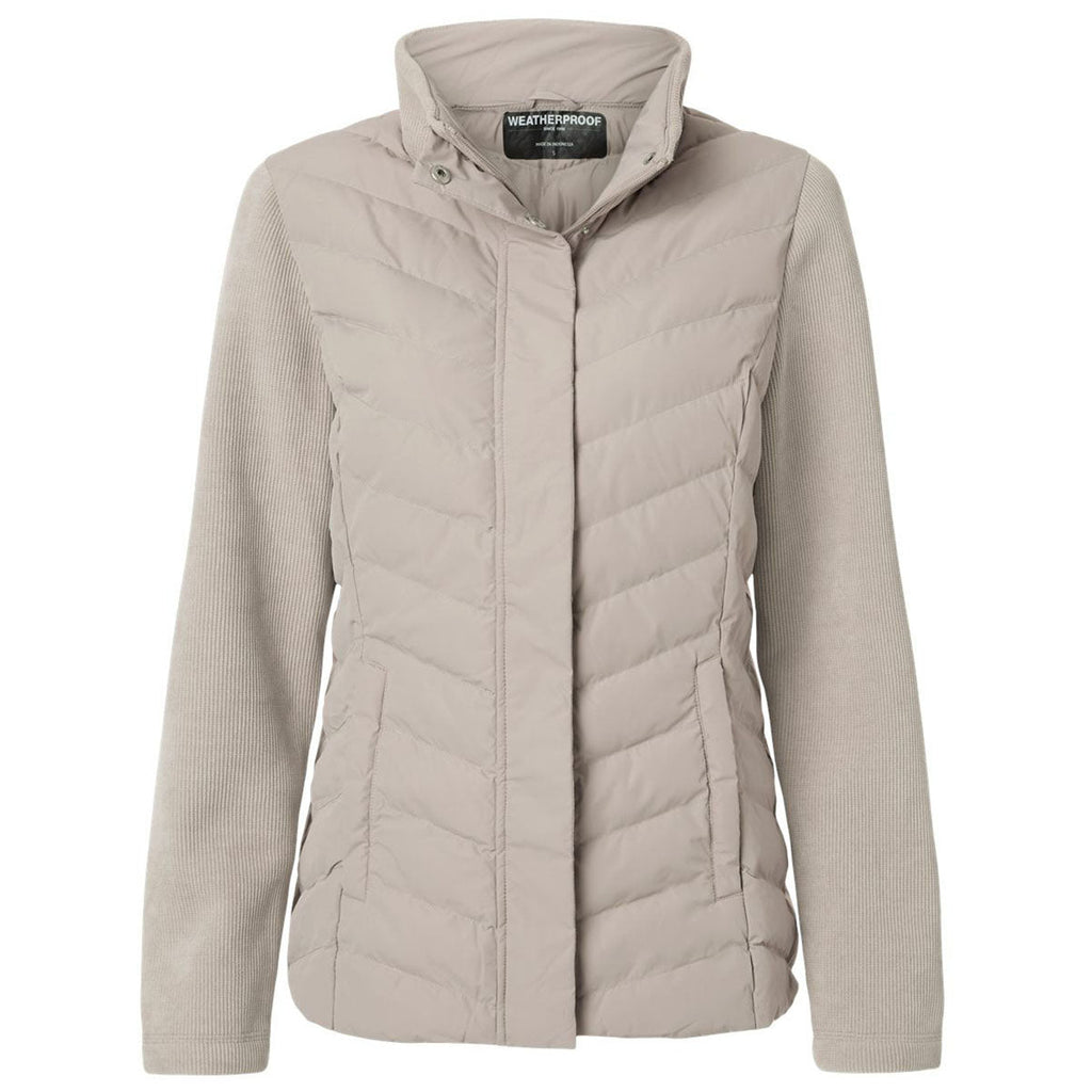 Weatherproof Women's Taupe Mixed Media Chevron Jacket allows for custom embroidery while blending style with performance. Its unique chevron design and lightweight poly fill deliver warmth and contemporary fashion. Perfect for commuting or outdoor layering, this jacket provides reliable protection, versatile wear, and a flattering fit for women seeking comfort, modern aesthetics, and professional-ready appeal.