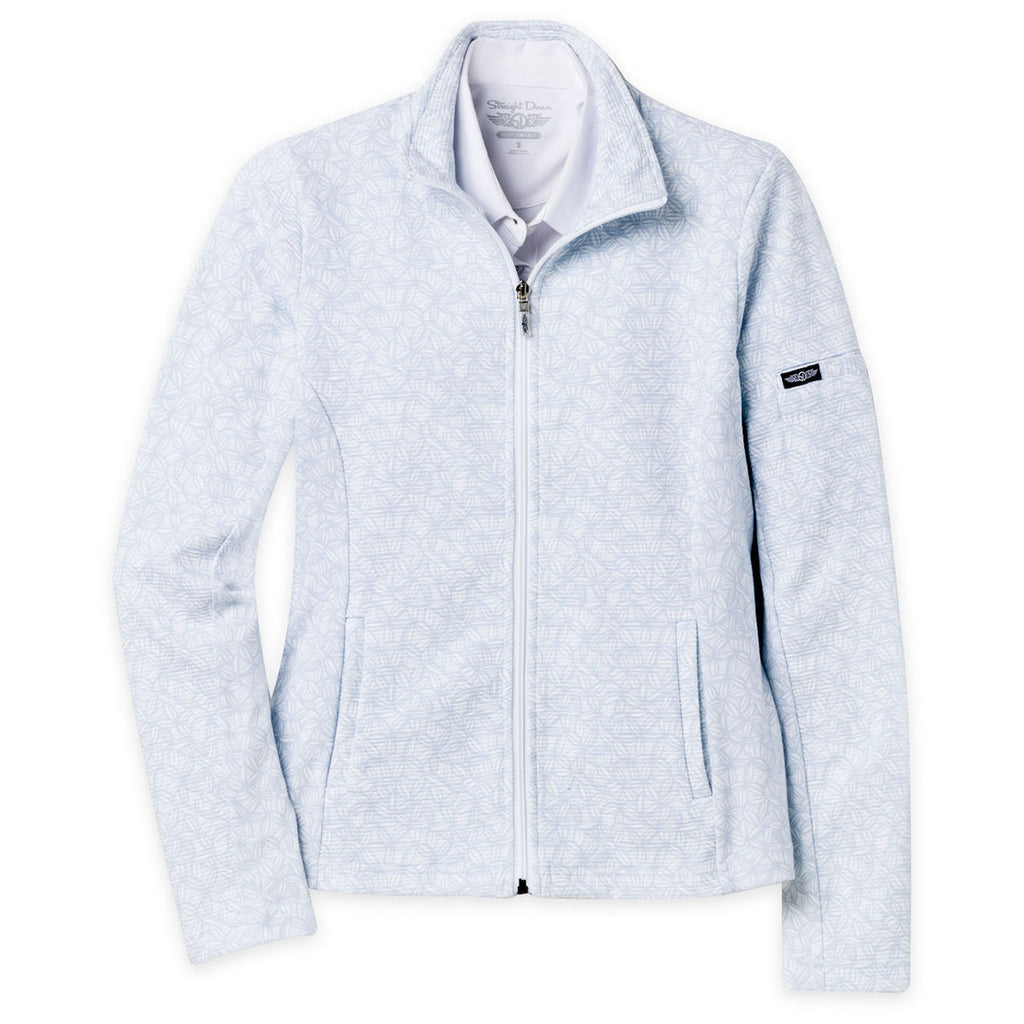 Elevate custom outerwear collections with the Straight Down Women's Leaves-Powder Blue Swing Jacket. This lightweight piece blends function with fashion, offering wind protection in a modern A-line design. The standing collar and zip front give it polish, while the stretch fabric adds comfort, which is ideal for branding or upscale activewear programs.Highlights